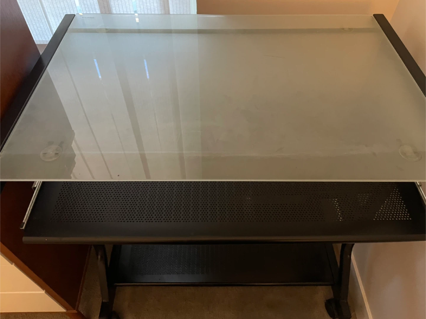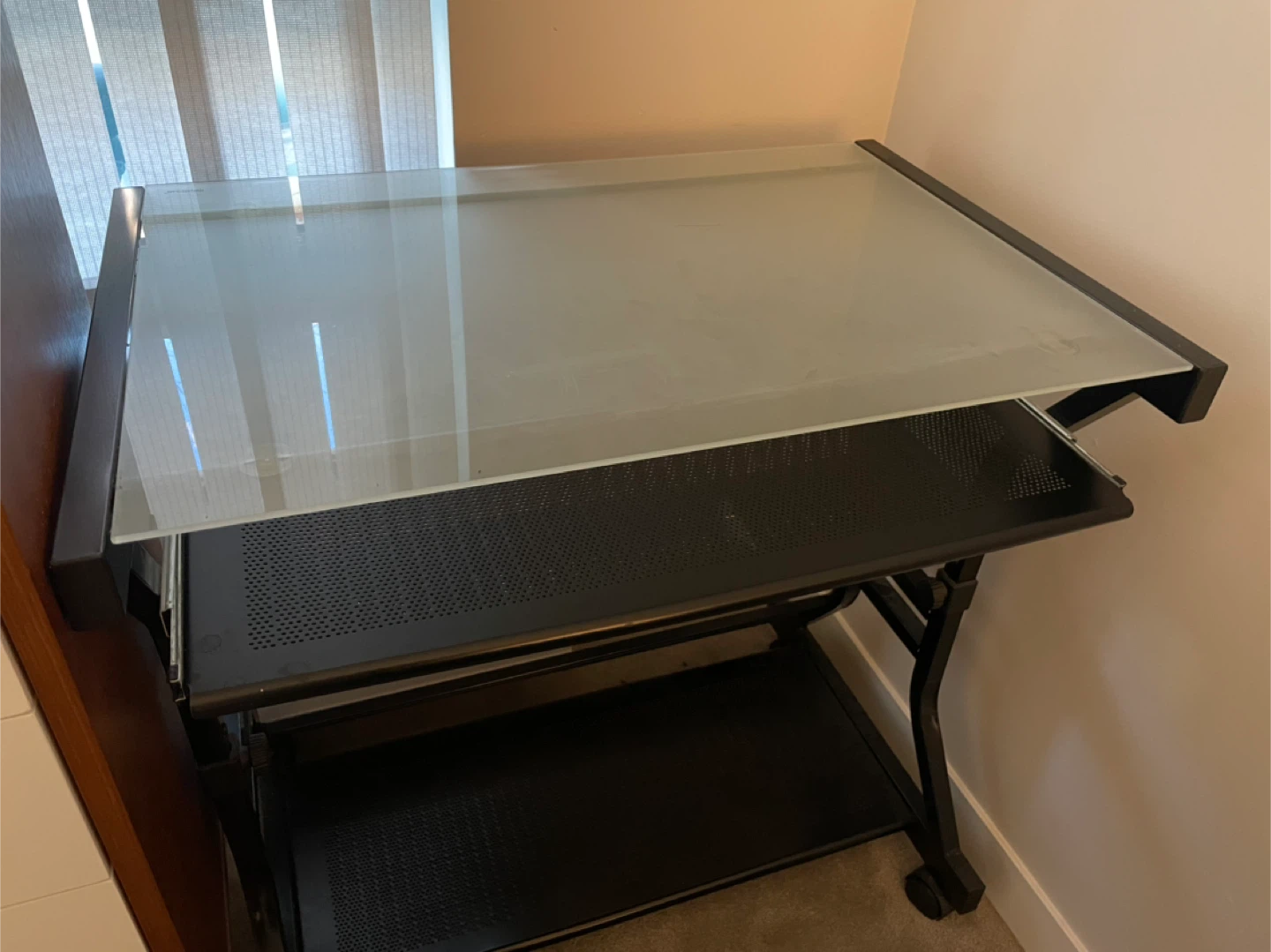Selling a study desk with a tension glass top, with rolling wheels and height adjustable.