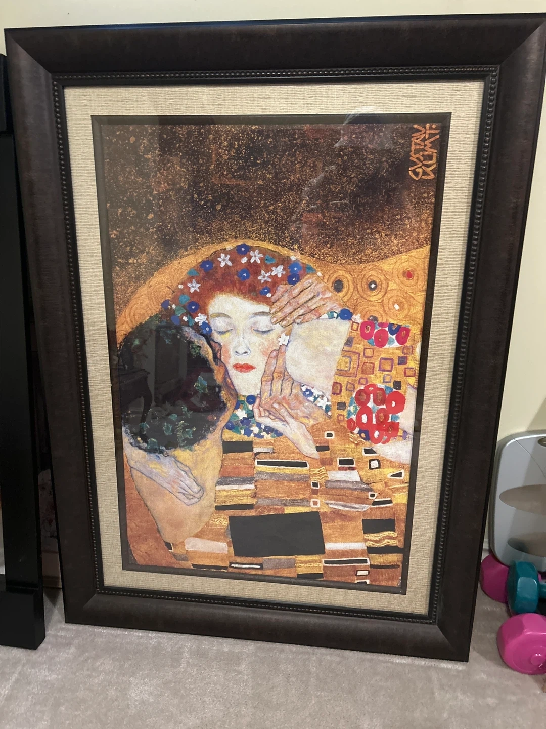 Framed print of Gustav Klimt's "The Kiss". This iconic artwork is beautifully presented in a dark wood frame with a textured matting. It's ready to add a touch of elegance to any room!