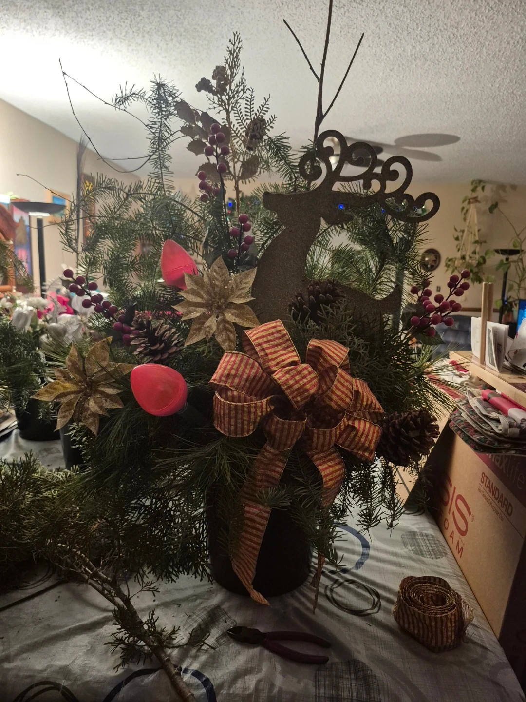 Selling a beautiful Christmas floral arrangement! Real greenery, fir, pine & cedar It's got a festive mix of pinecones, red berries, gold poinsettias, and a gold reindeer. Perfect for adding some holiday cheer to your home. Can be put inside or outside . 10" pot