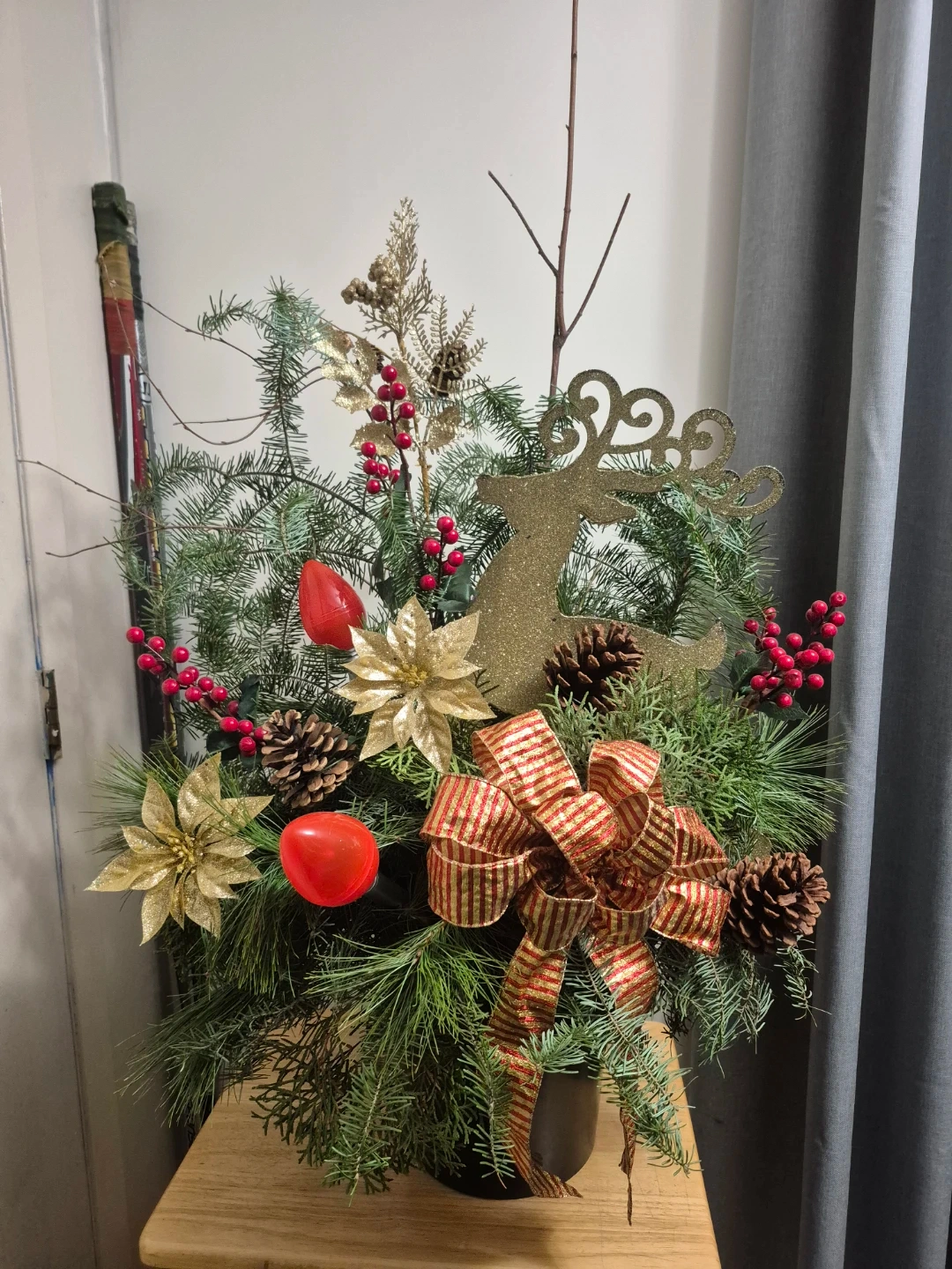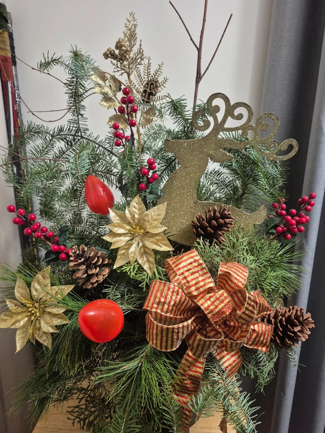 Selling a beautiful Christmas floral arrangement! Real greenery, fir, pine & cedar It's got a festive mix of pinecones, red berries, gold poinsettias, and a gold reindeer. Perfect for adding some holiday cheer to your home. Can be put inside or outside . 10" pot