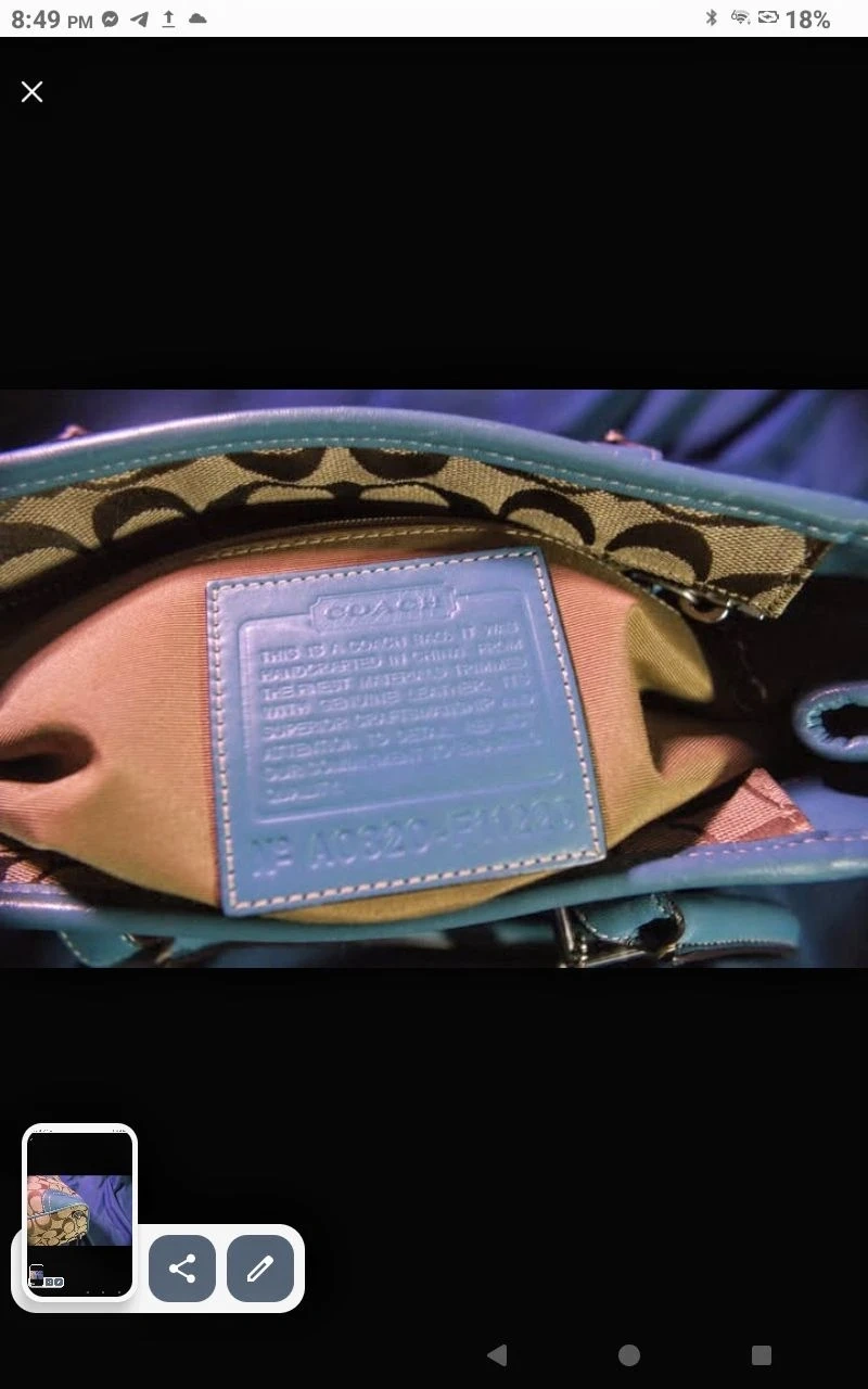 A pre-loved Coach handbag featuring the signature C print with light blue leather accents. It has a top handle and a secure closure. This bag is a classic accessory for everyday use.