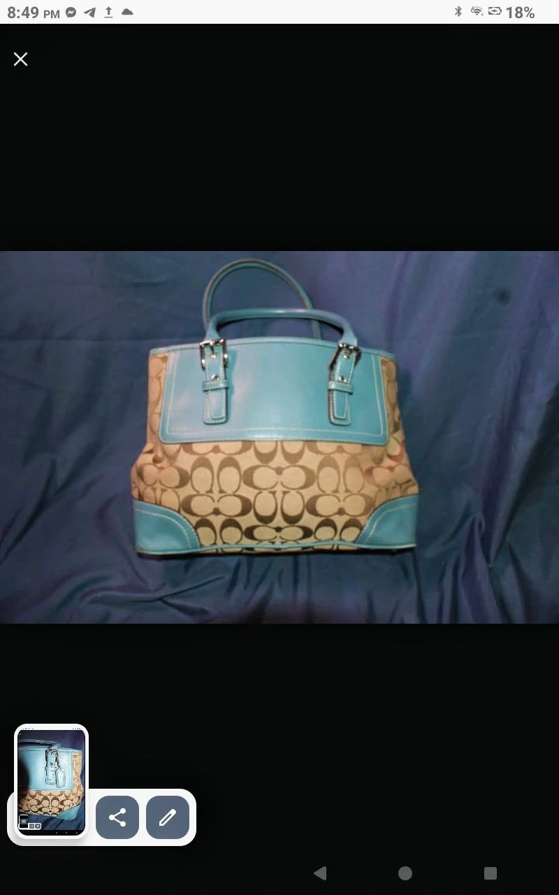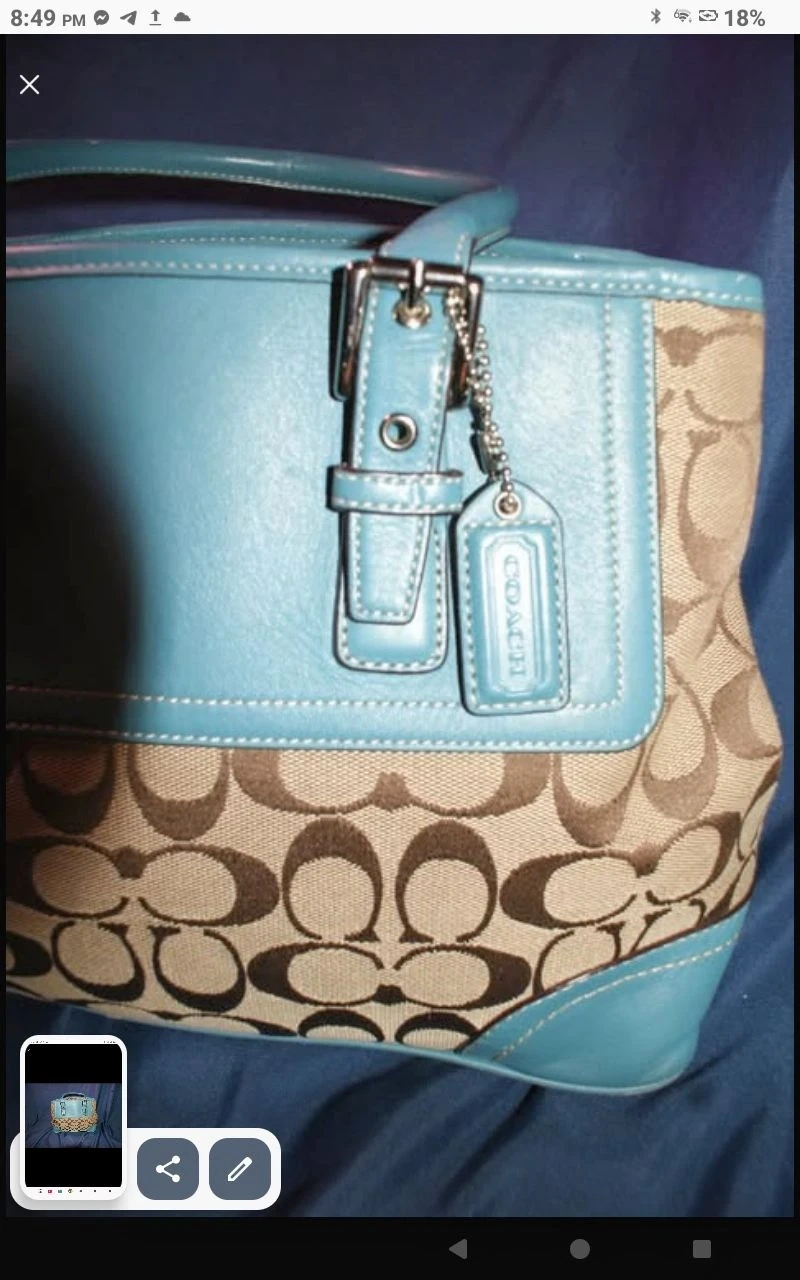 A pre-loved Coach handbag featuring the signature C print with light blue leather accents. It has a top handle and a secure closure. This bag is a classic accessory for everyday use.