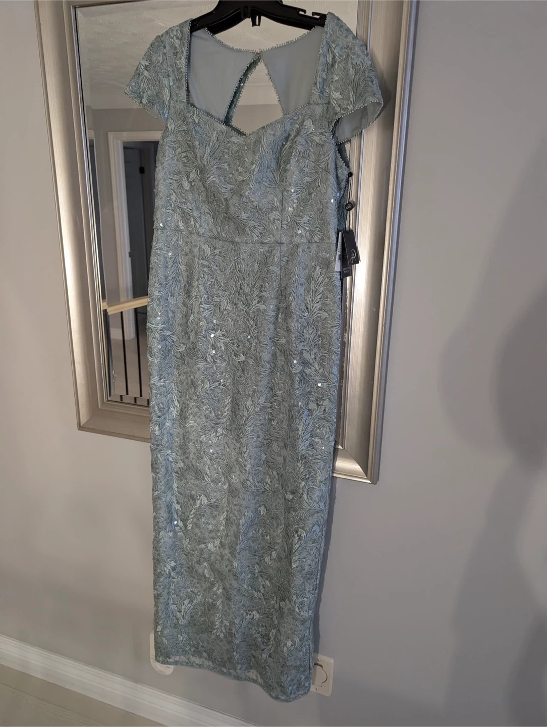 This elegant Adrianna Papell dress features a delicate lace overlay with subtle beading. It has short sleeves and a flattering silhouette. Perfect for a formal occasion!