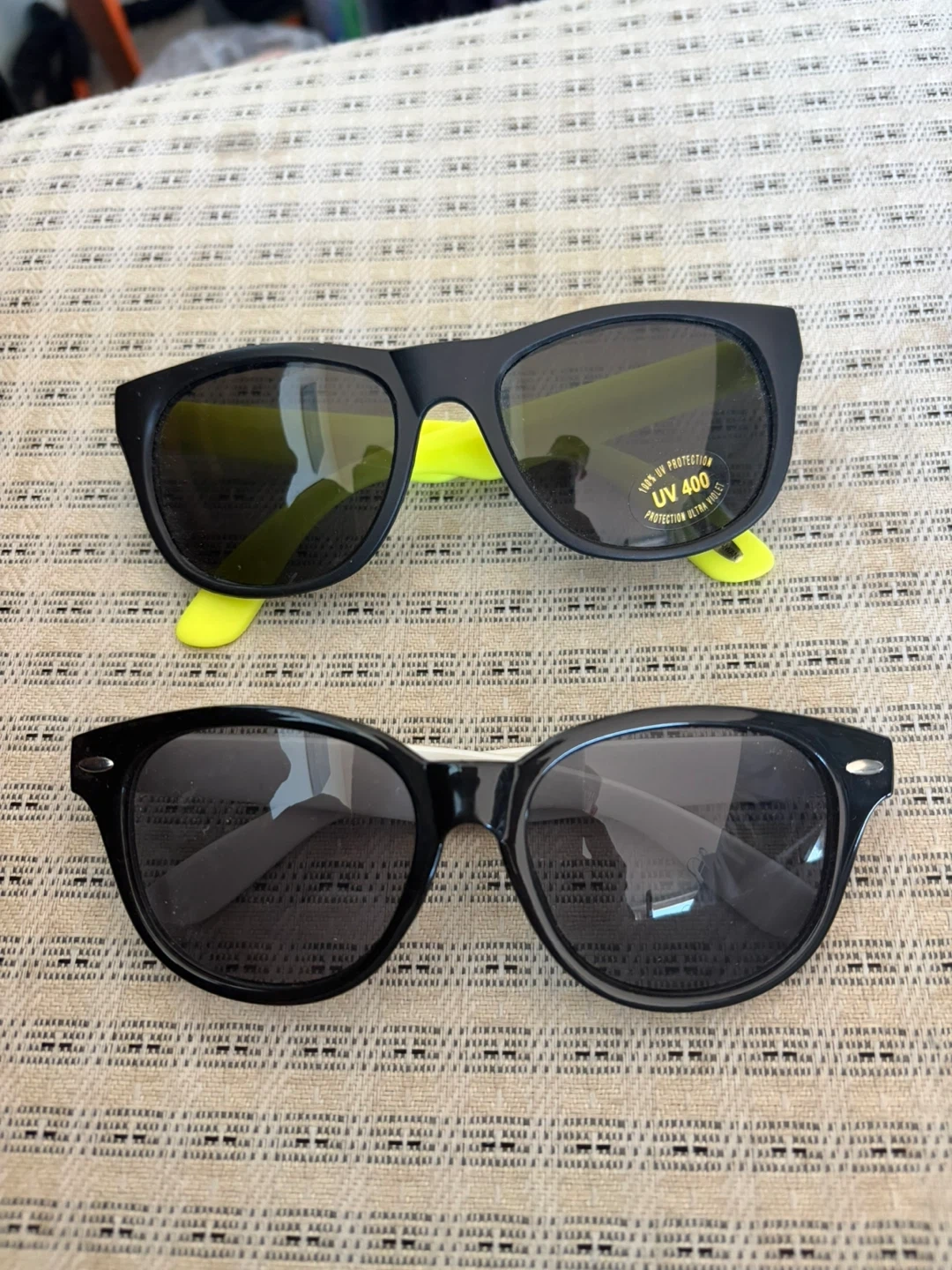 Two pairs of sunglasses included. One black pair with clear lenses and one black pair with neon yellow arms. Both offer UV 400 protection. Great for sunny days!