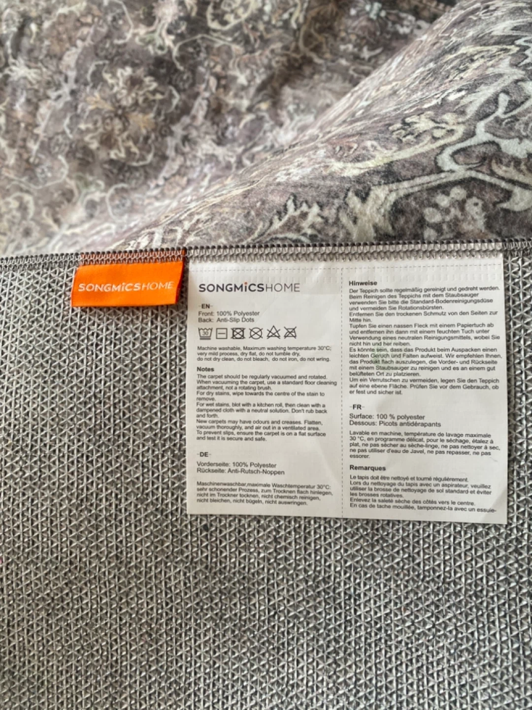 Brand new never used SONGMICS HOME patterned area rug. This rug is 100% polyester, super soft. Has anti-slip dots on the back so it won't slide around. Machine washable, easy to clean. Still in its original packaging.