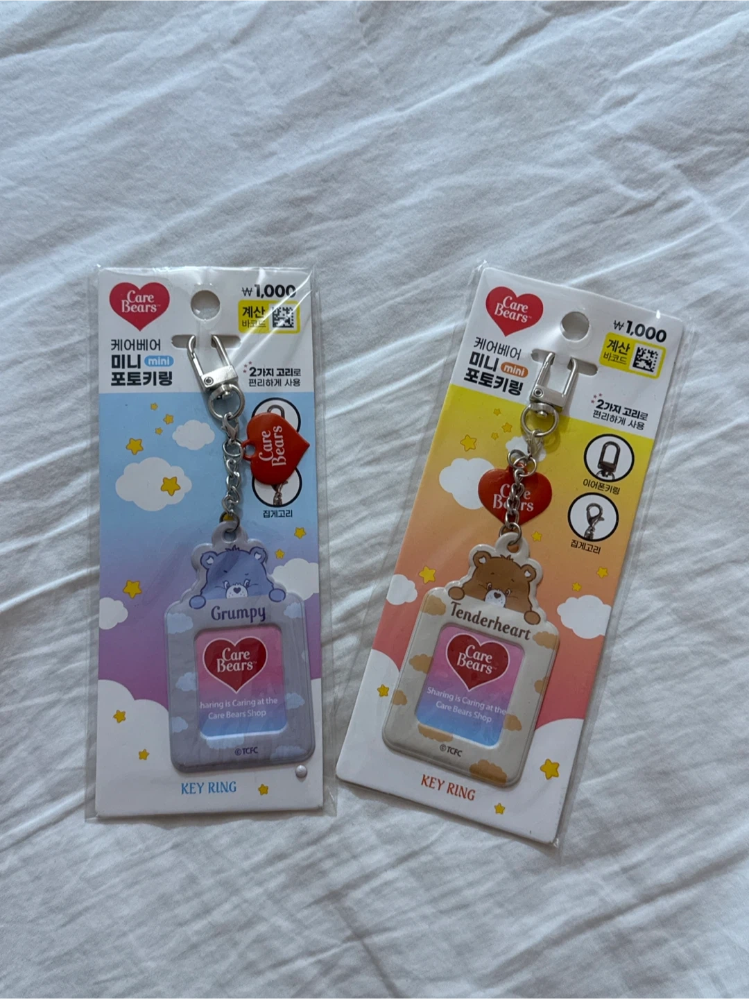 Two Care Bears mini photo keyrings featuring Grumpy and Tenderheart characters. They're designed with two different hooks for convenient use. These keyrings are great for personalizing your bags or keys!