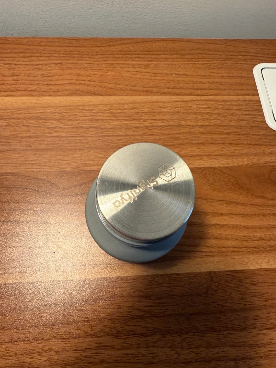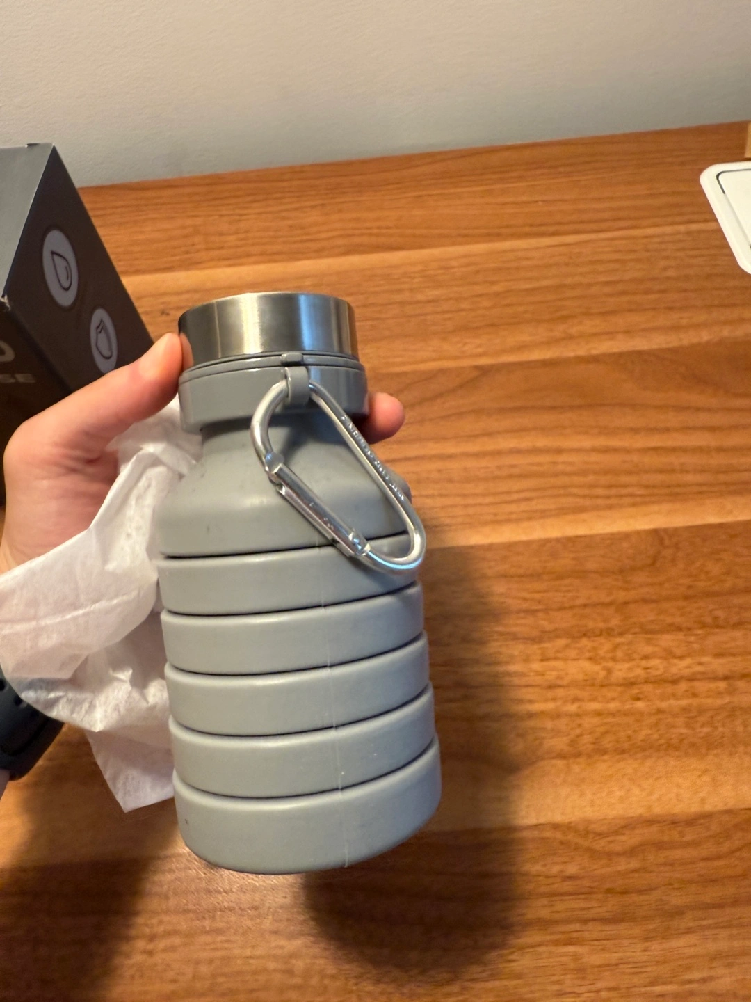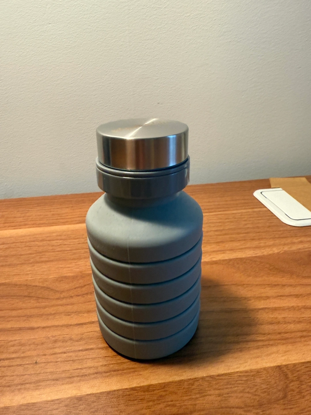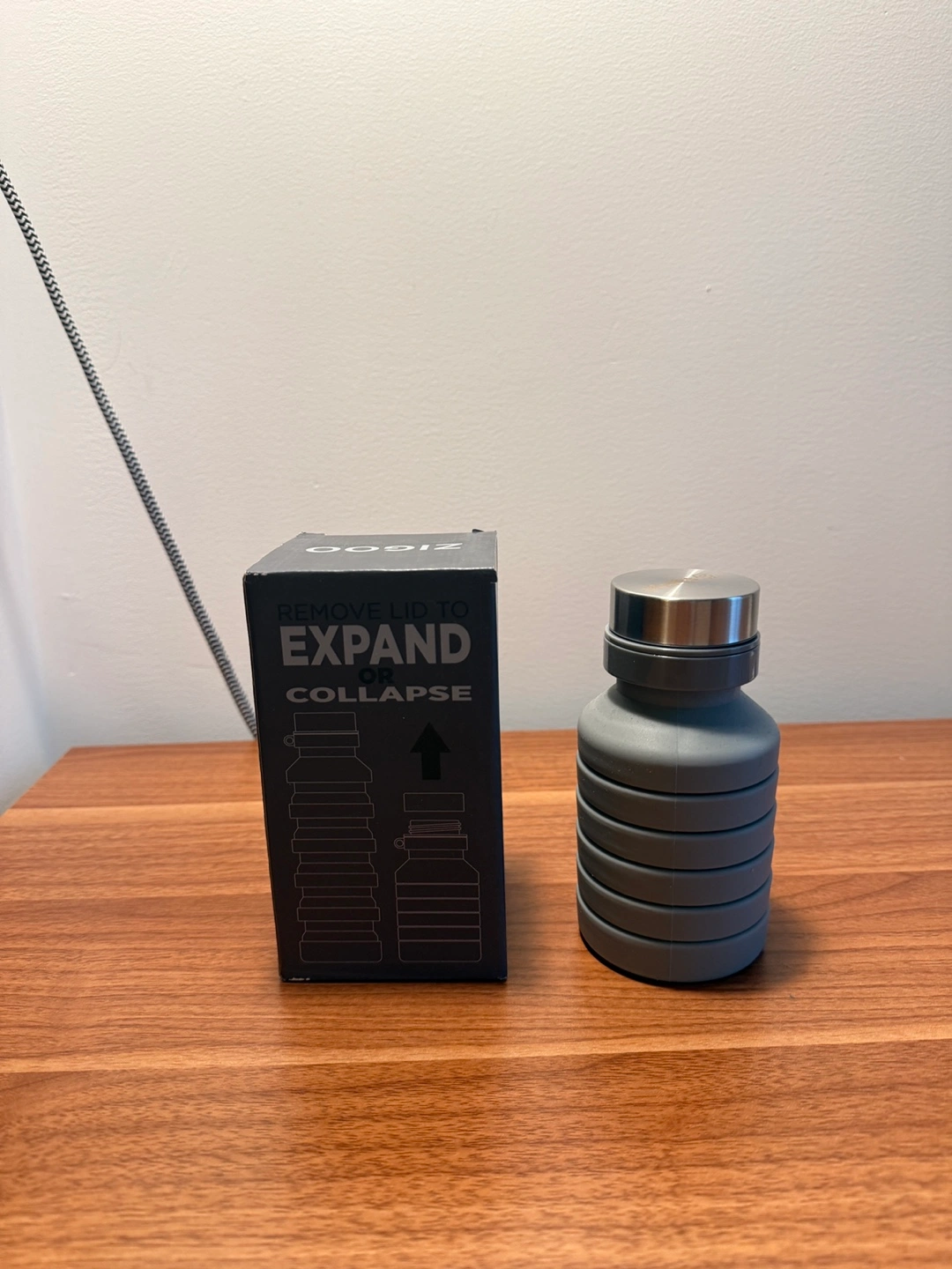 A collapsible water bottle. It has a stainless steel lid. The bottle body is made of grey silicone. It also comes with a silver carabiner clip for easy carry. A great water bottle to have on hand for any hike or workout.
