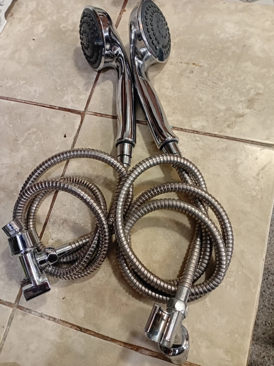 This listing is for a set of two chrome shower heads. Each shower head comes with a flexible metal hose for easy installation and use. The shower heads have multiple spray settings. Great for upgrading your bathroom experience!