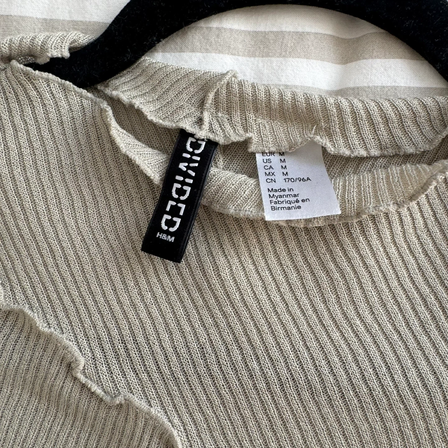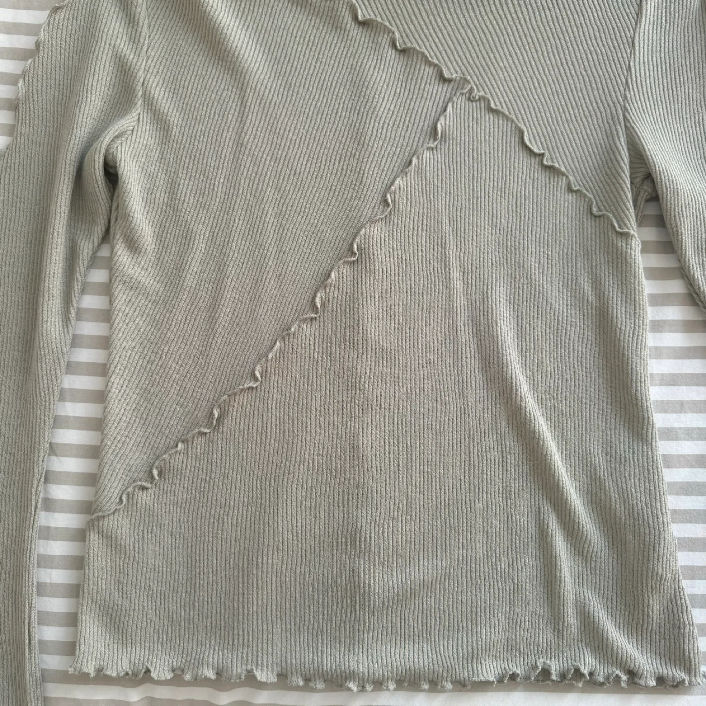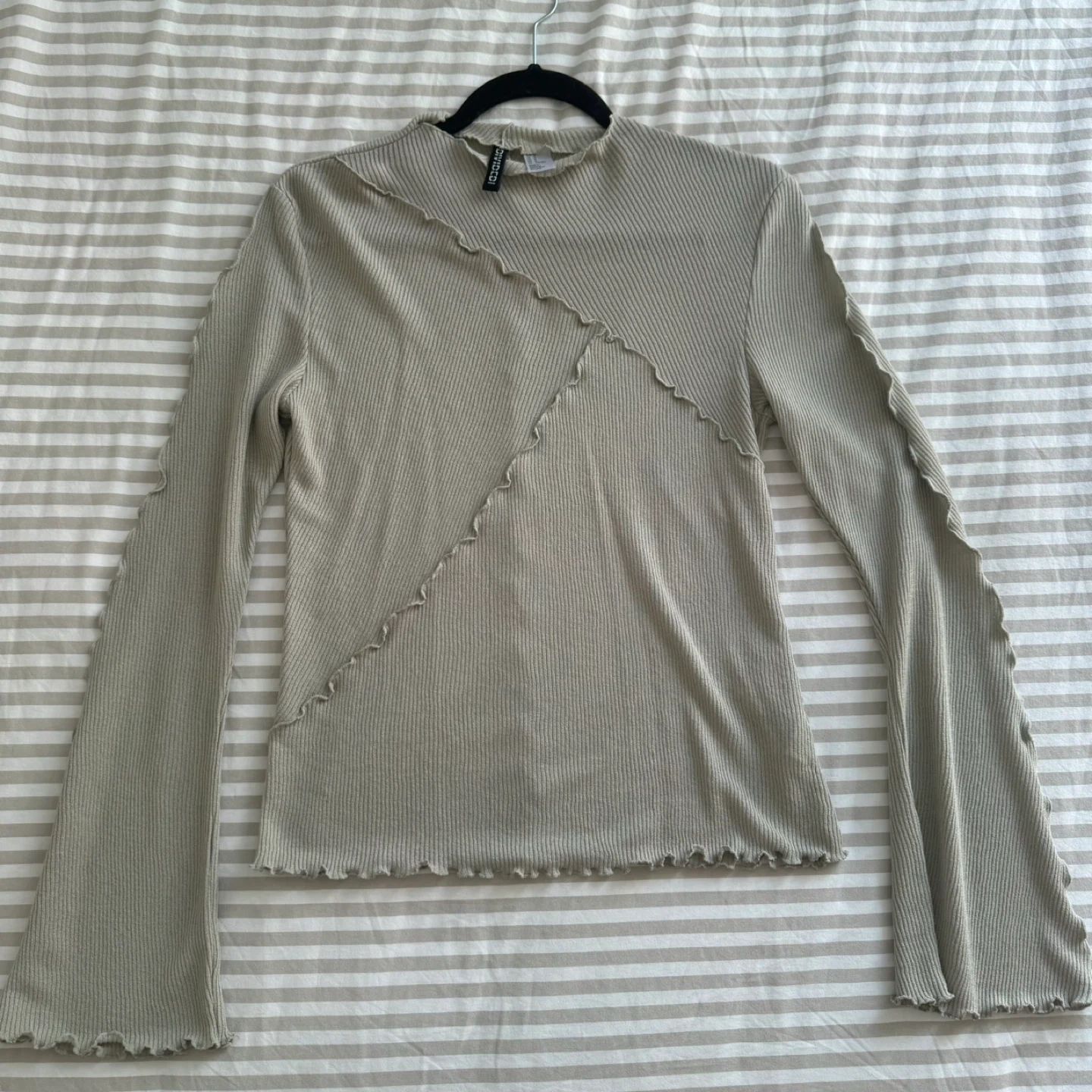 Selling a cute long sleeve top from H&M's Divided line! It's a size medium and features a unique asymmetrical design with lettuce edge detailing. The colour is a lovely neutral sage green. Perfect for layering or wearing on its own! Washed but never worn!