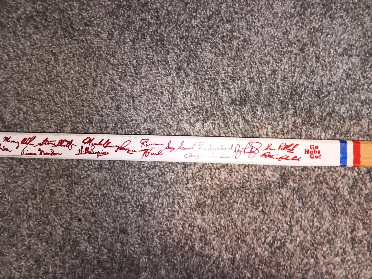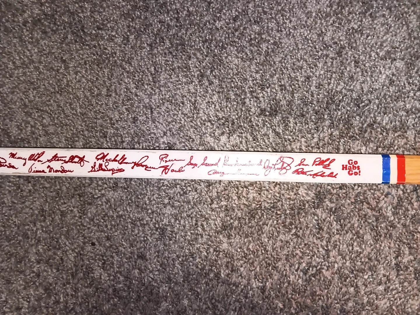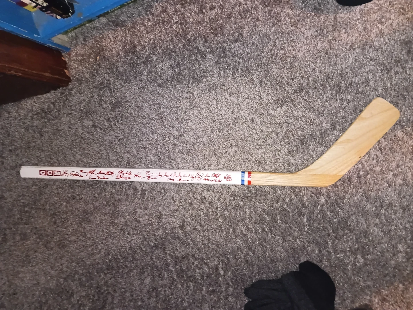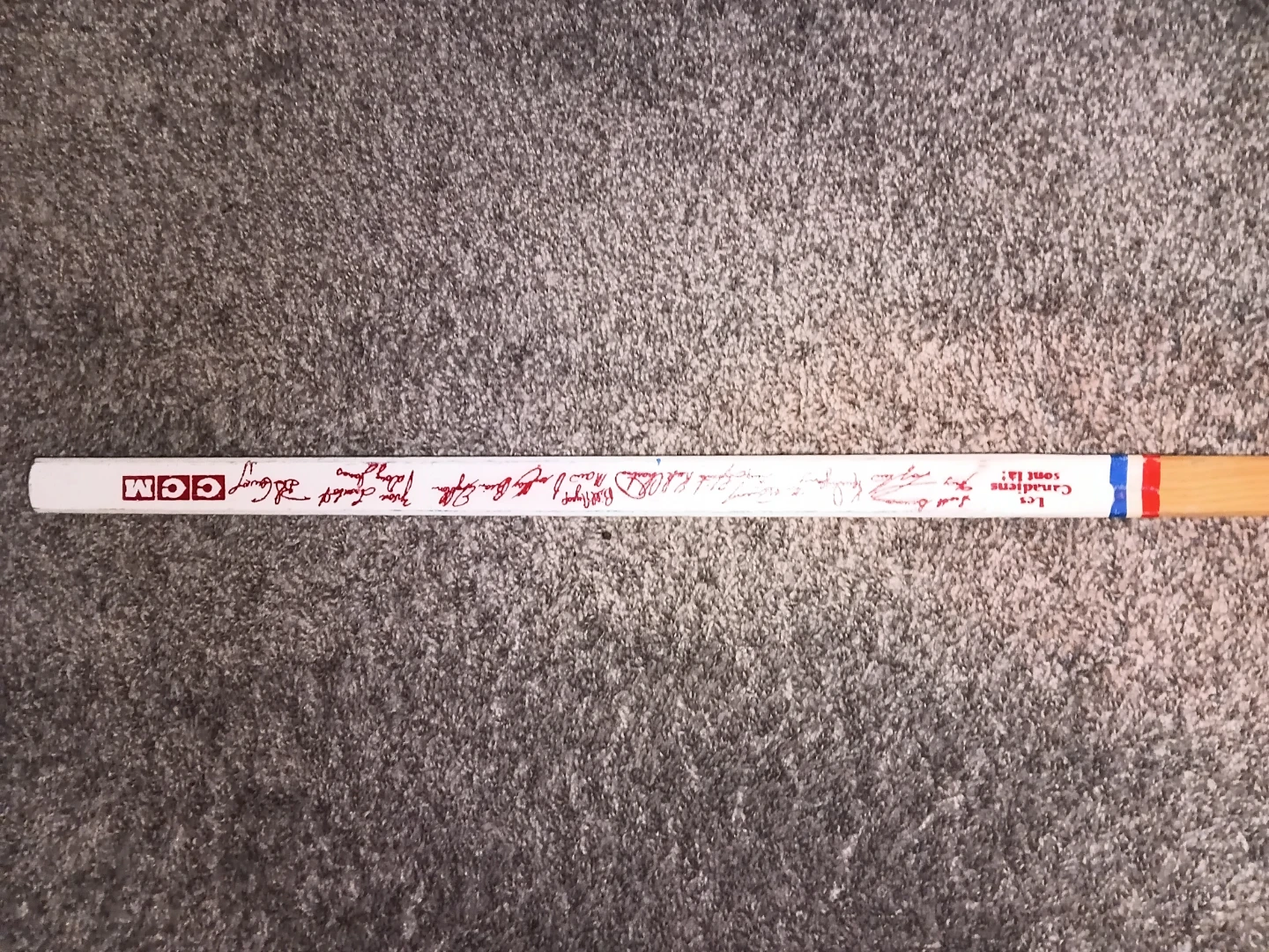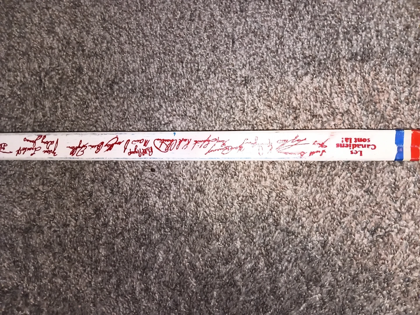 This CCM hockey stick is signed by numerous players. It features red and blue accents near the blade. A great collectible for any hockey fan!