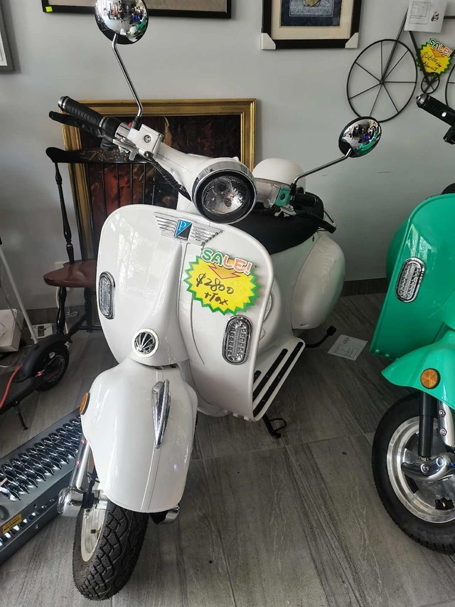 Beautiful white retro VESPA style all electric, no more gas, ride with style. Low floor, easy to hop in and out, hydraulic brake, back disc break upgrade, rear view mirrors. More other styles and spec available.
