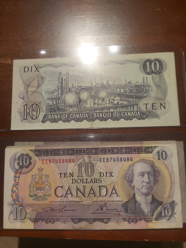 Selling two vintage Canadian $10 bank notes. One features an industrial landscape on the back, and the other features a portrait. Both are in good condition for their age!