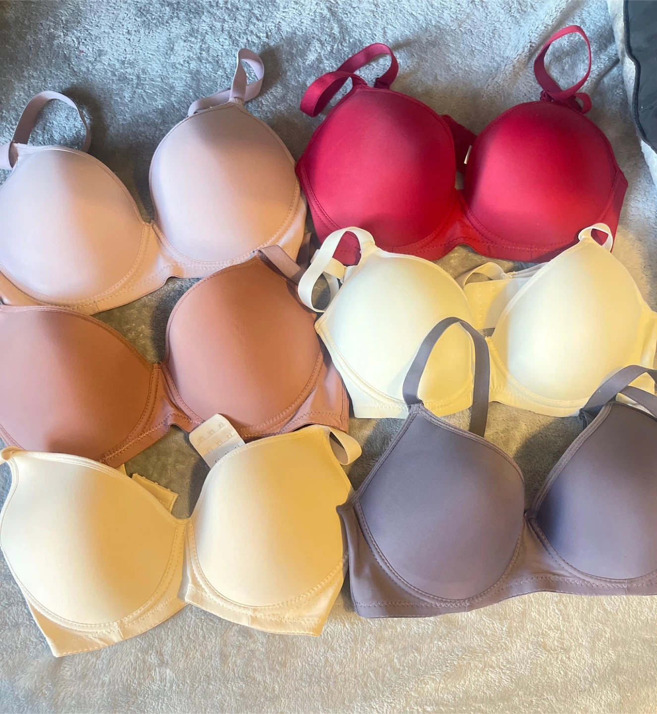 This is a lot of 8 women's bras in various colors including pink, red, beige, cream, and purple. They're all full coverage and appear to be made of a soft, stretchy material. Sizes are not visible in the images.