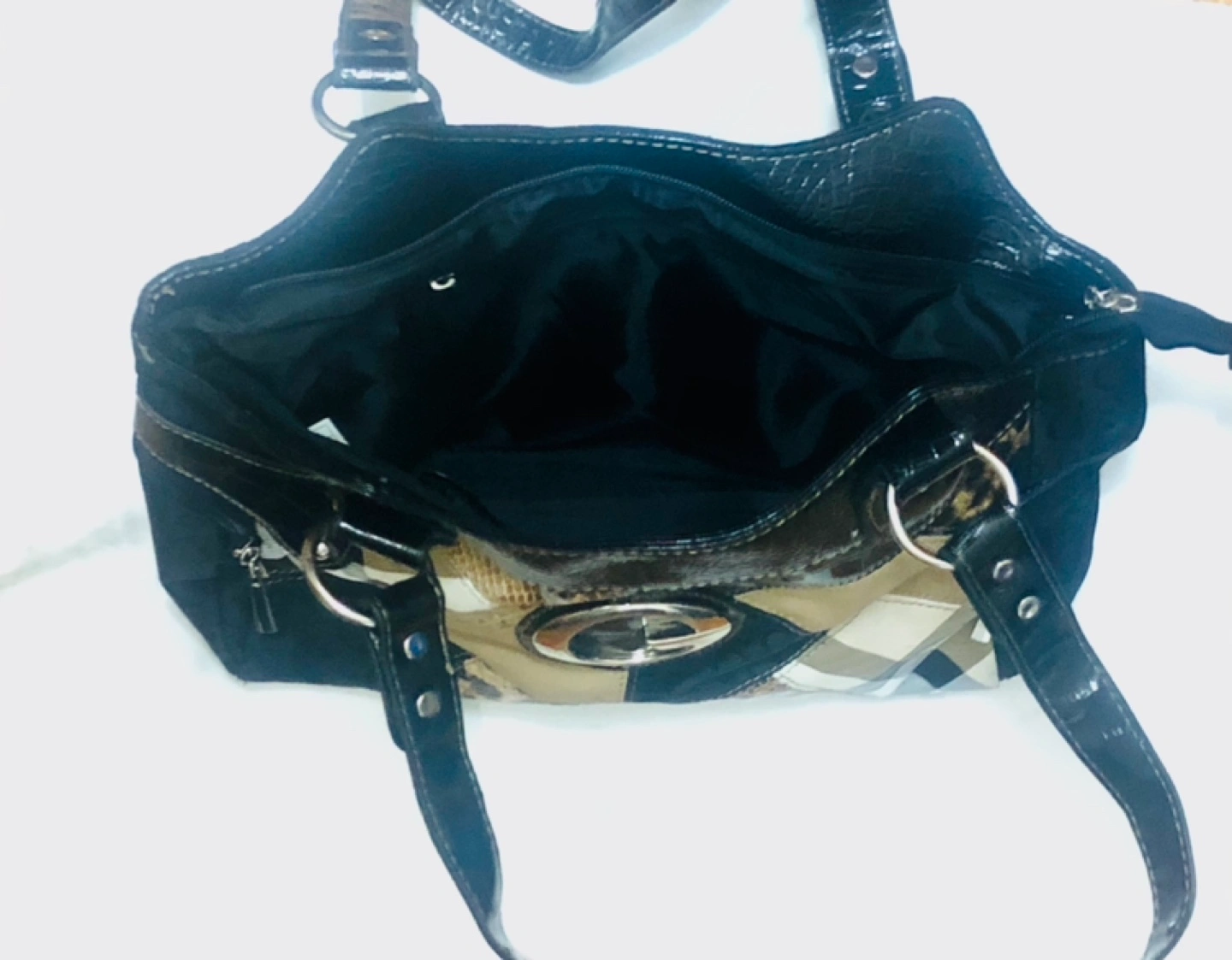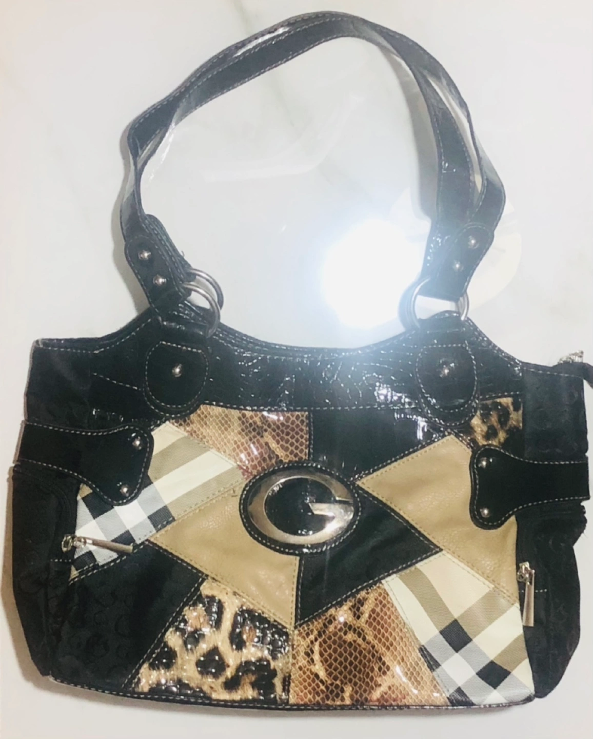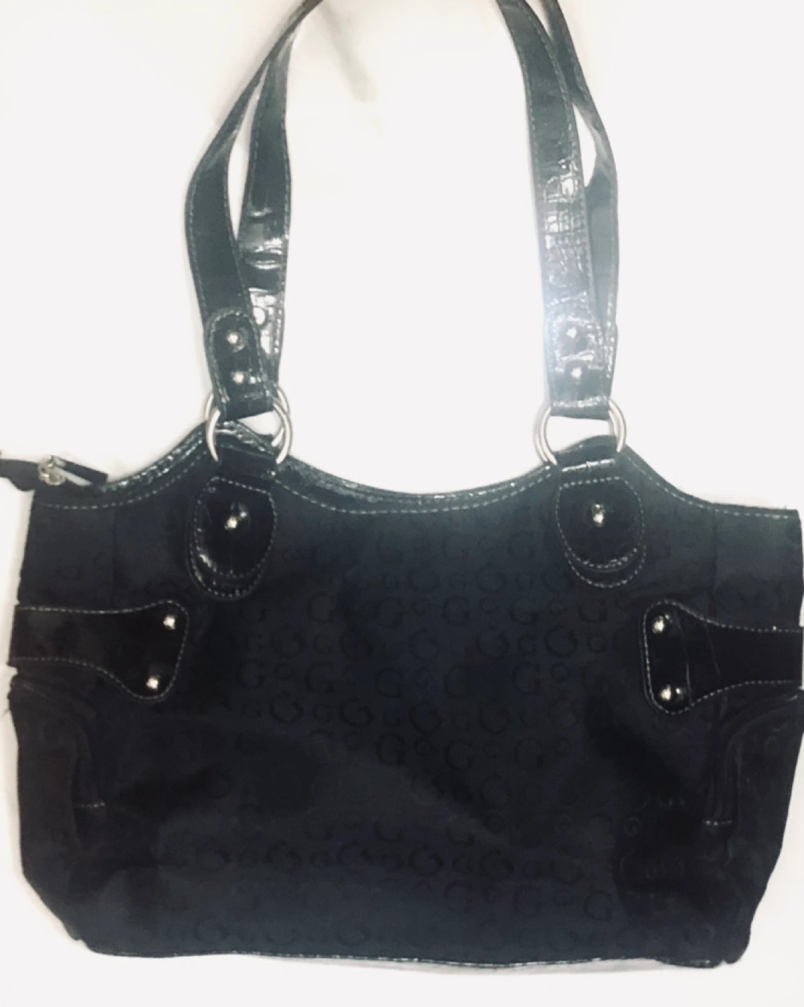 Black handbag with patchwork design. Features a large silver Guess logo on the front and a zipper closure.