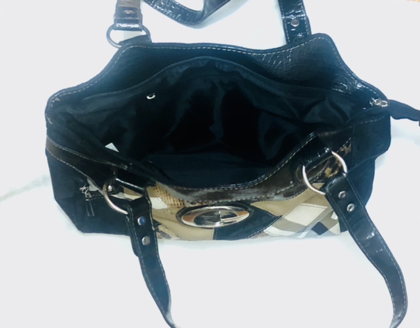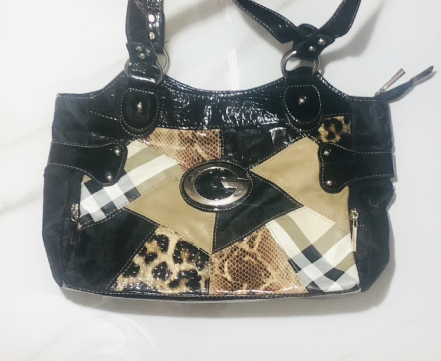 Black handbag with patchwork design. Features a large silver Guess logo on the front and a zipper closure.