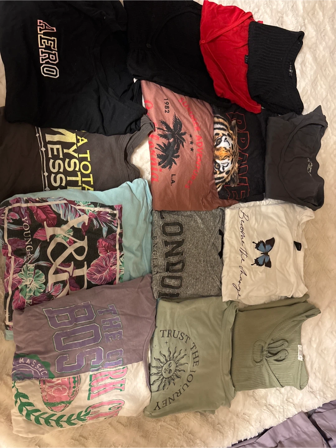 Selling a mixed lot of t-shirts. There are various designs and colours, including brands like AERO,SHEIN, Ardennes. $5each or $50 for all