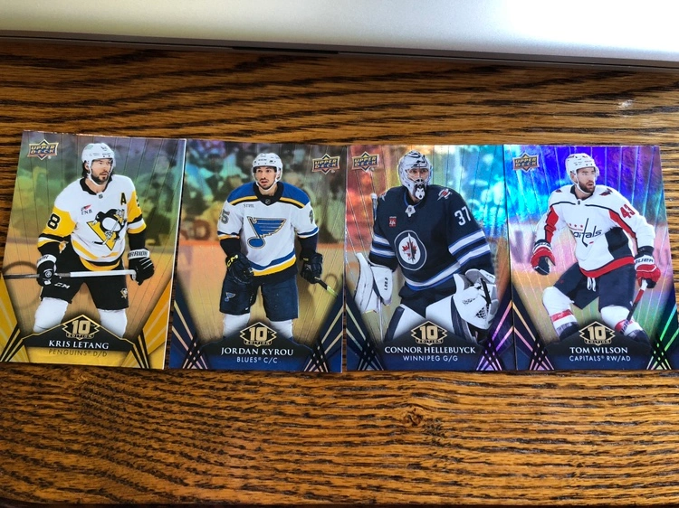Set of 4 Upper Deck 10 Years Series hockey cards featuring Kris Letang, Jordan Kyrou, Connor Hellebuyck, and Tom Wilson. Pick cards you need $1.25 a card