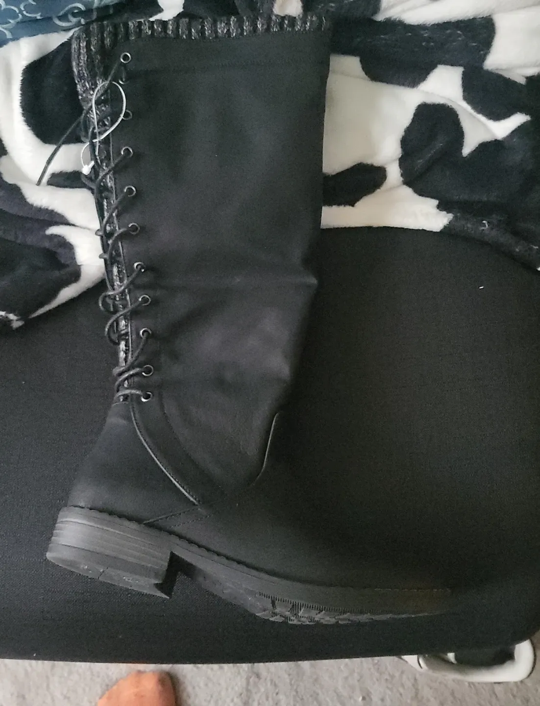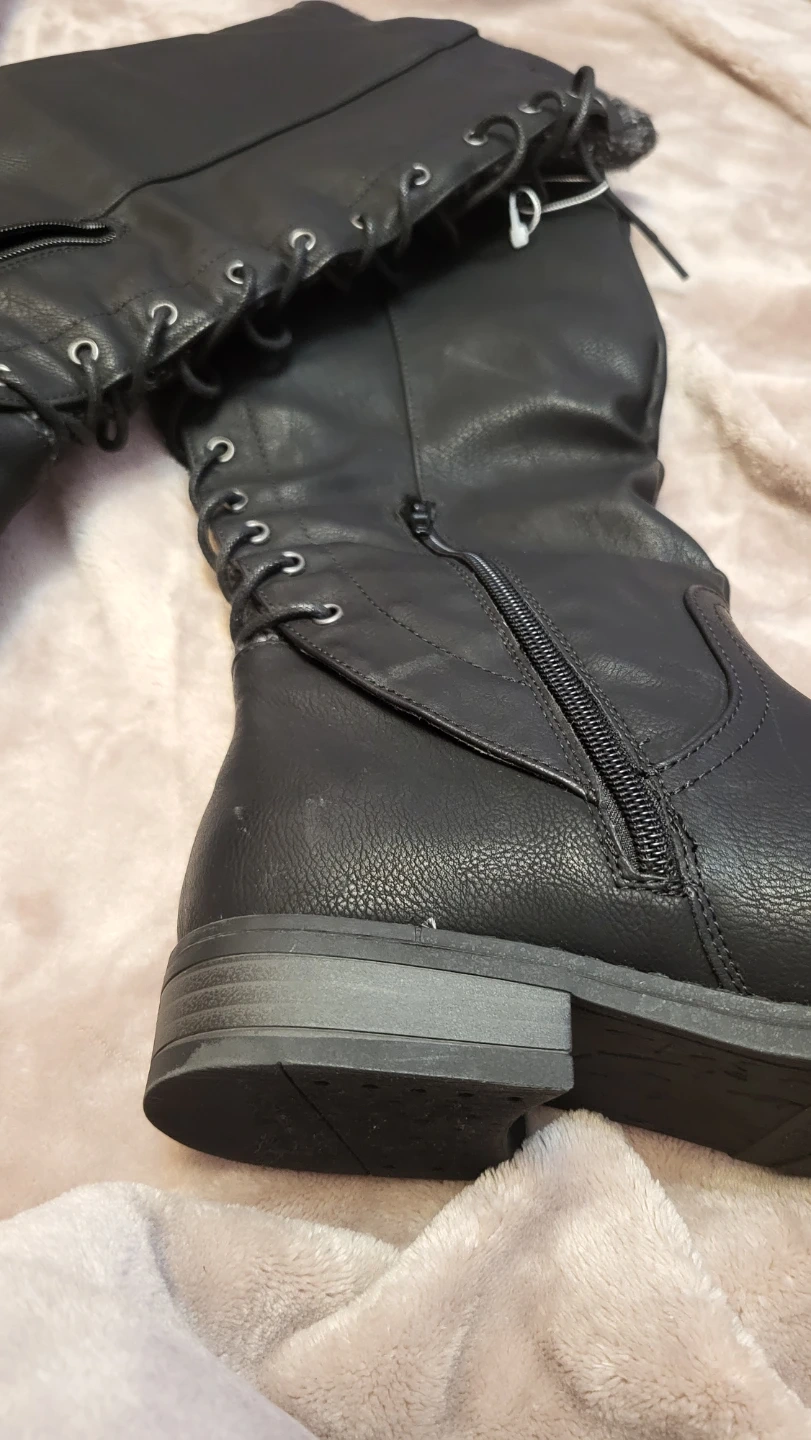 Selling a pair of black knee-high boots. They have a lace-up design and a zipper closure on the side. There are a few minor scuffs on the material, but overall they are in good condition. The size is 8M.