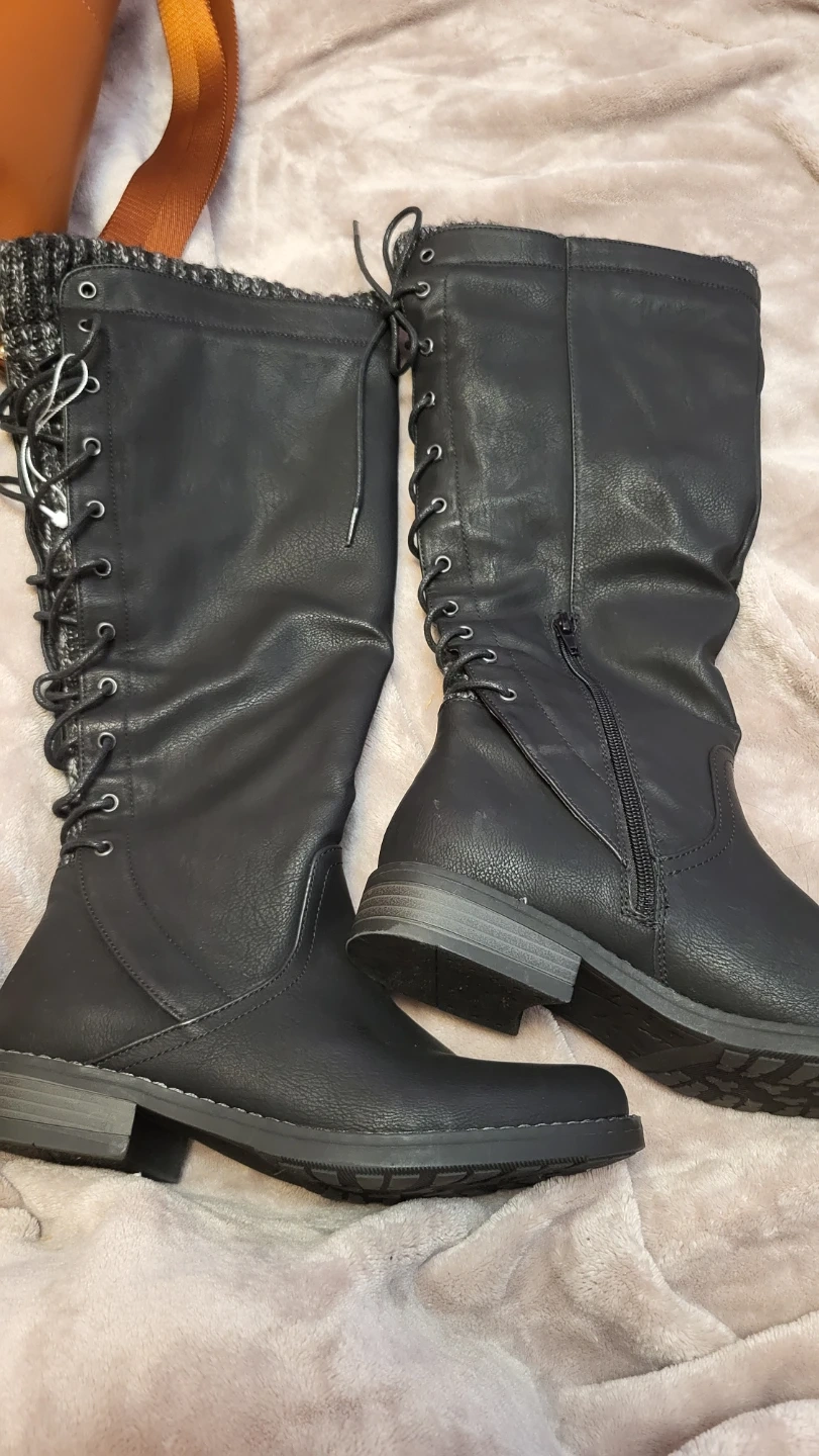 Selling a pair of black knee-high boots. They have a lace-up design and a zipper closure on the side. There are a few minor scuffs on the material, but overall they are in good condition. The size is 8M.