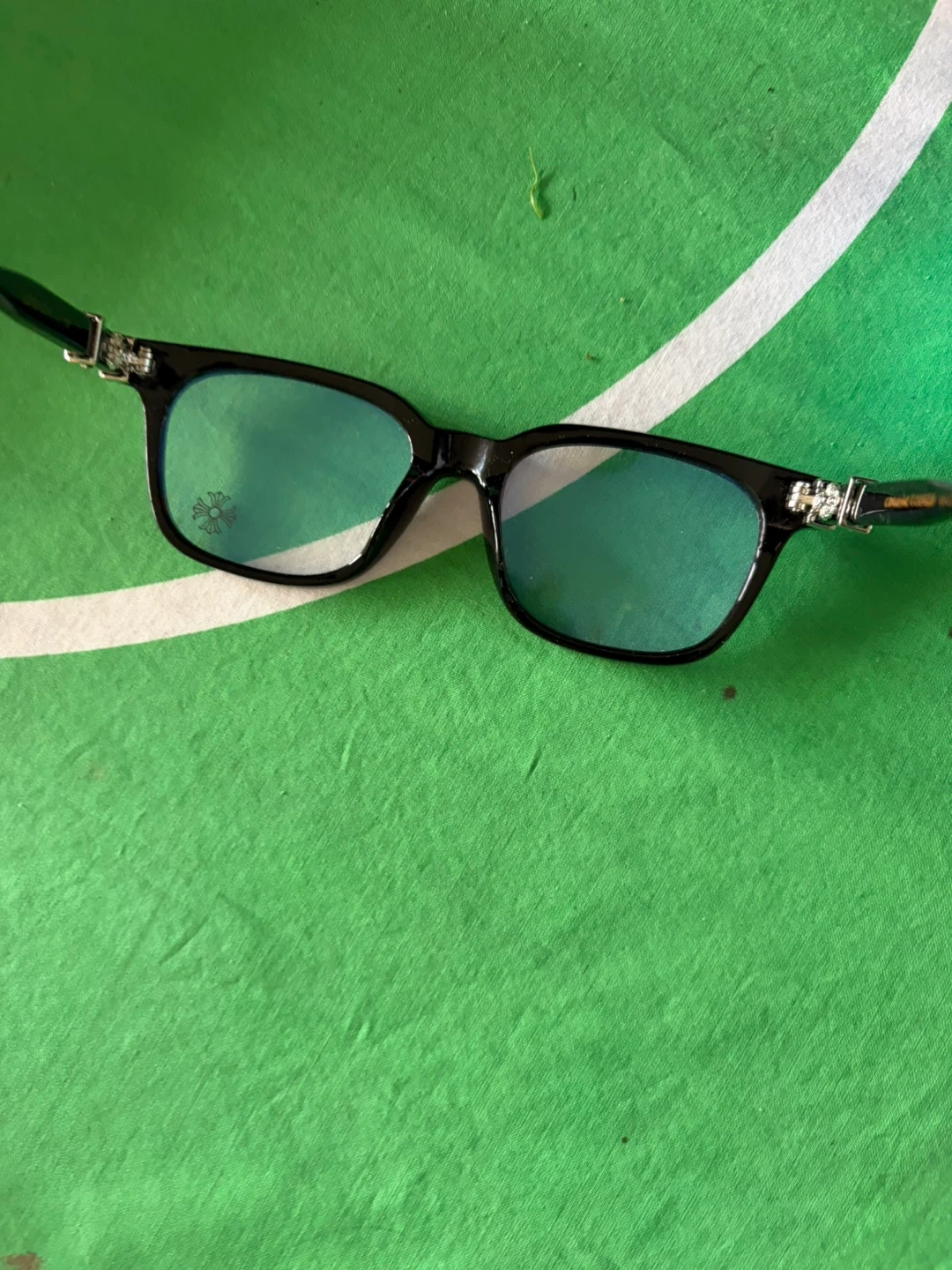 These black Chrome Hearts glasses feature intricate silver detailing on the frames. They're stylish and well-made. Perfect for adding a touch of luxury to your everyday look!