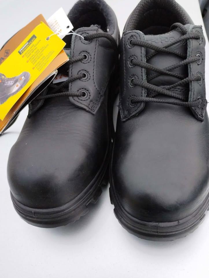 Stay safe and comfortable during your work day with the black safety shoes. These extra-wide shoes are made from full-grain leather, with a polyurethane outsole and midsole and a Cleanfeet(R) liner for long wear. Each lace-up pair features removable insoles and non-marking, chemical-resisting soles.