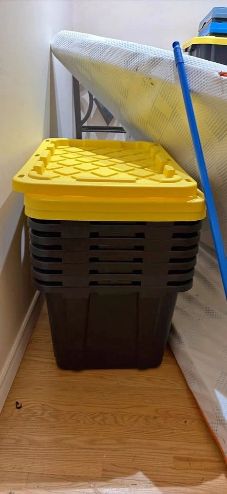 Durable plastic storage bins come in a set of five with matching yellow lids. These heavy-duty totes are black with reinforced lids for stacking. Great for organizing garage or basement.