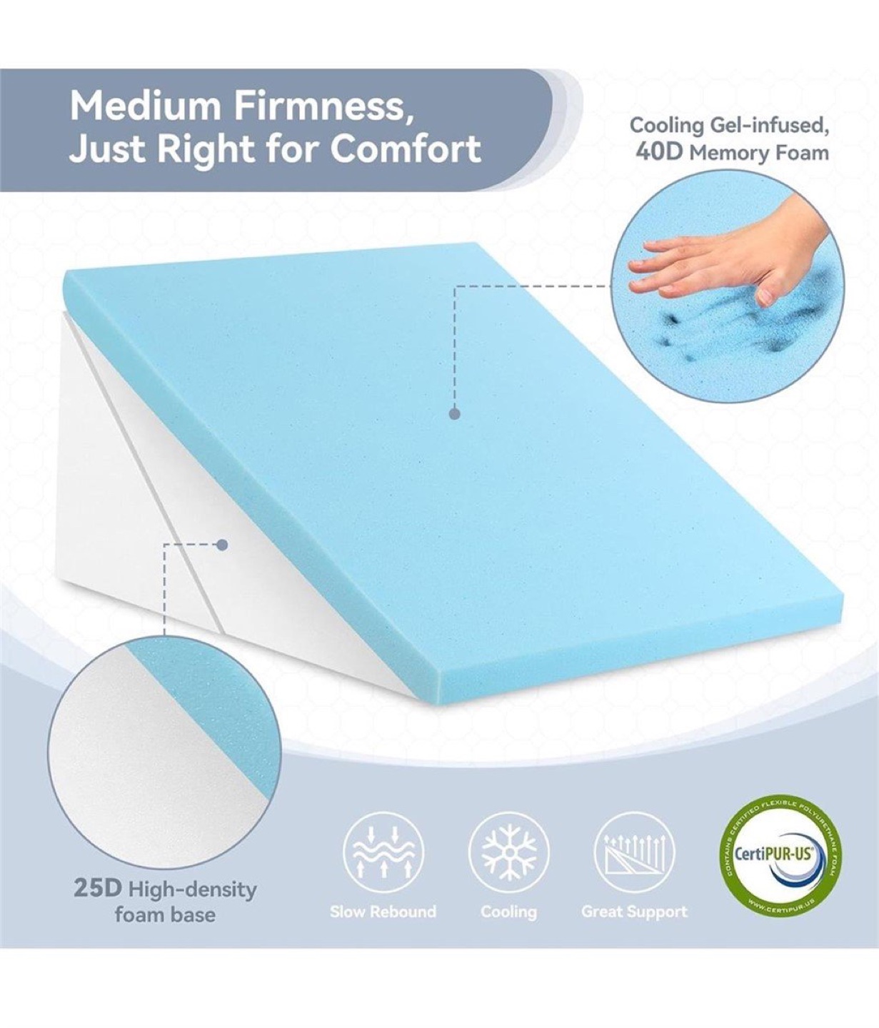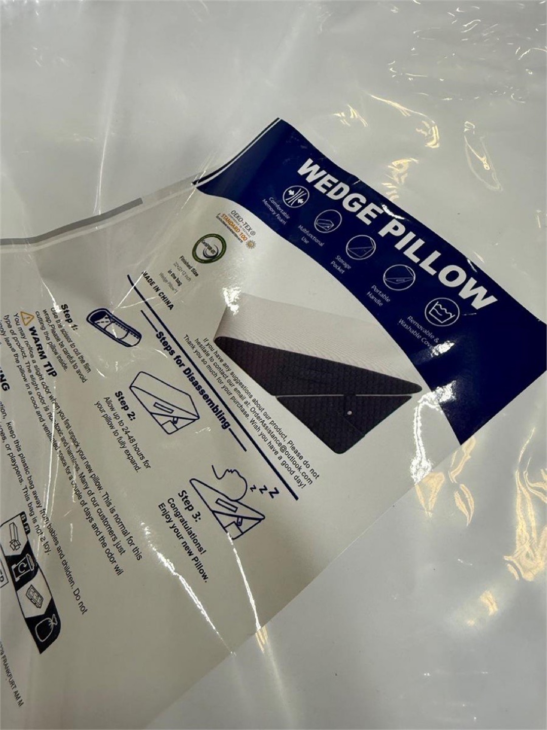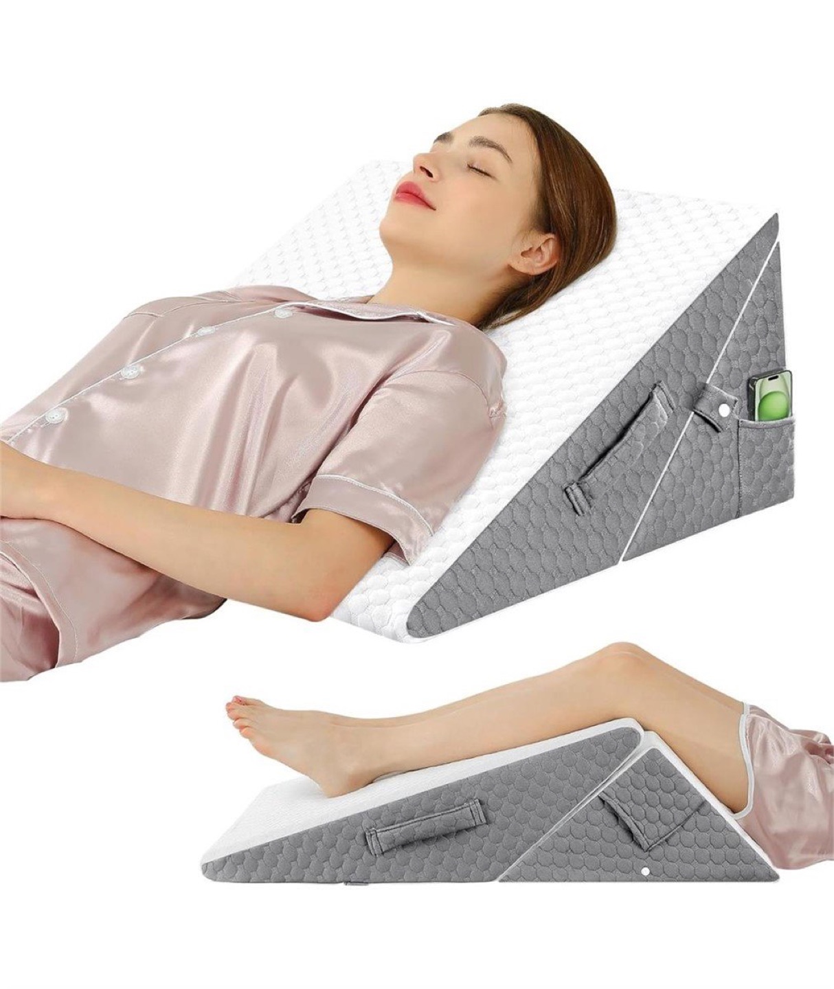 Selling a wedge pillow that's still in its original packaging! It's a 7-in-1 multipurpose pillow, great for sitting, high incline, low incline, relaxing low incline, high knee support, low knee support, and extended leg elevation. It features medium firmness with cooling gel-infused 40D memory foam and a 25D high-density foam base. It also has a removable & washable cover and a storage pocket!