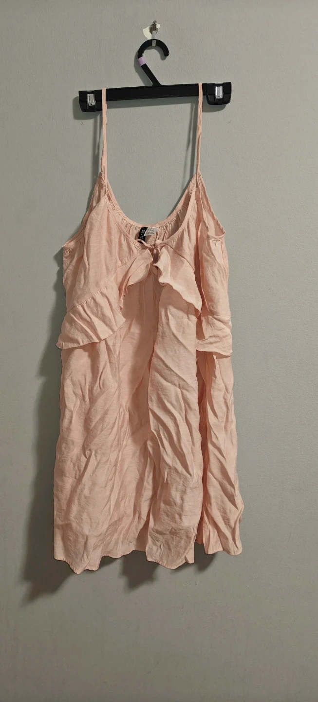 This is a cute pink dress H&M. It features delicate spaghetti straps and a ruffled front detail. Lightweight and breathable fabric for warm weather comfort.