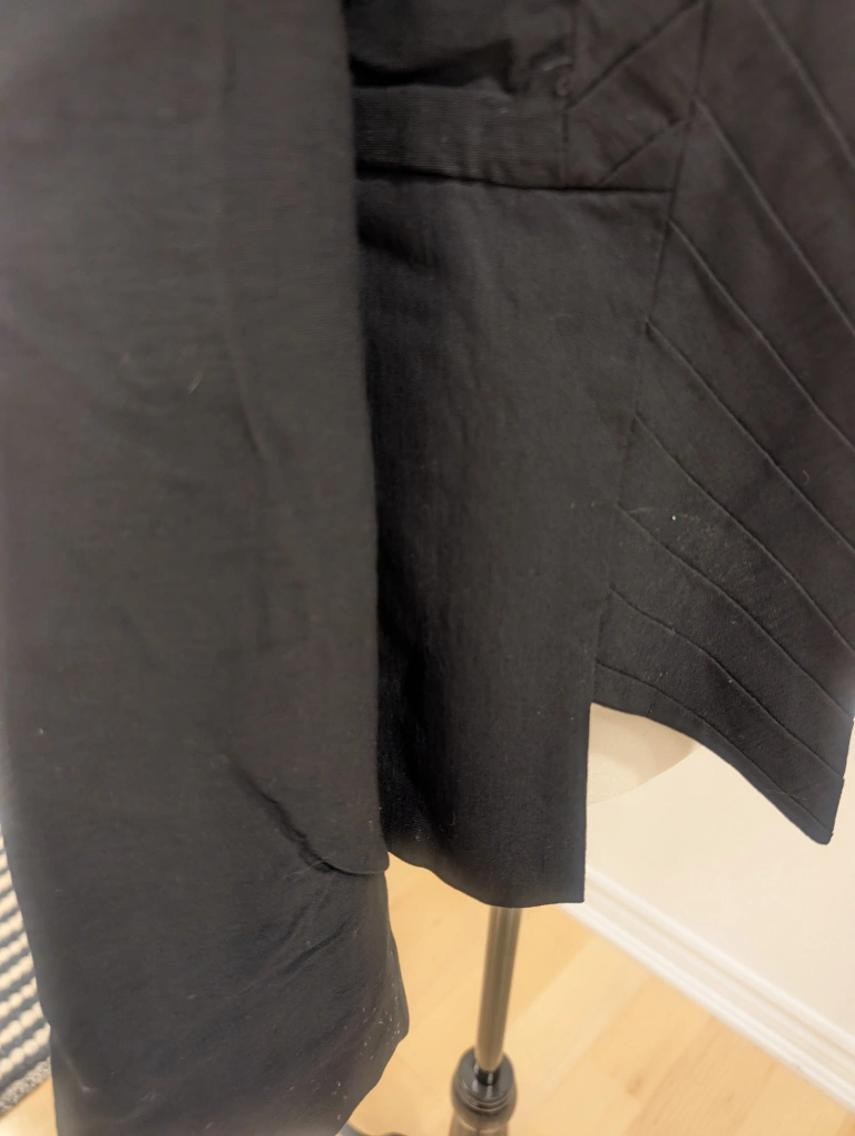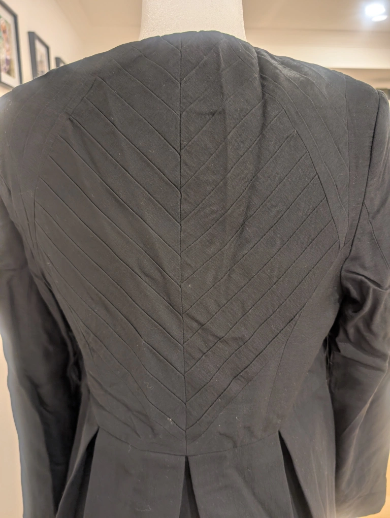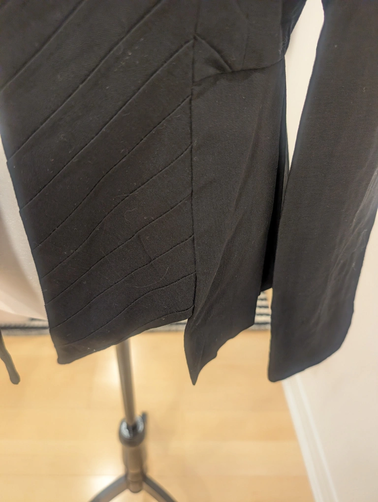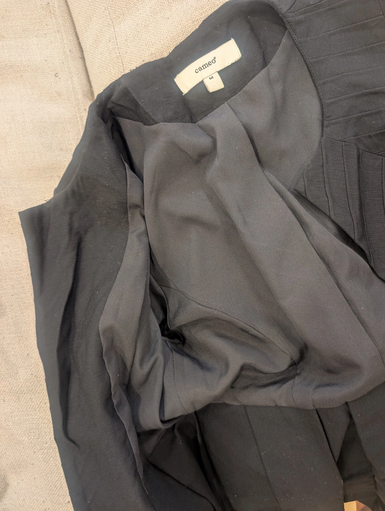 Selling a stylish black blazer from Cameo in size M! It's in great condition and features a unique and flattering pleated design. Elegant detailing and fitted waist line are so chic. Perfect for adding a touch of sophistication to any outfit