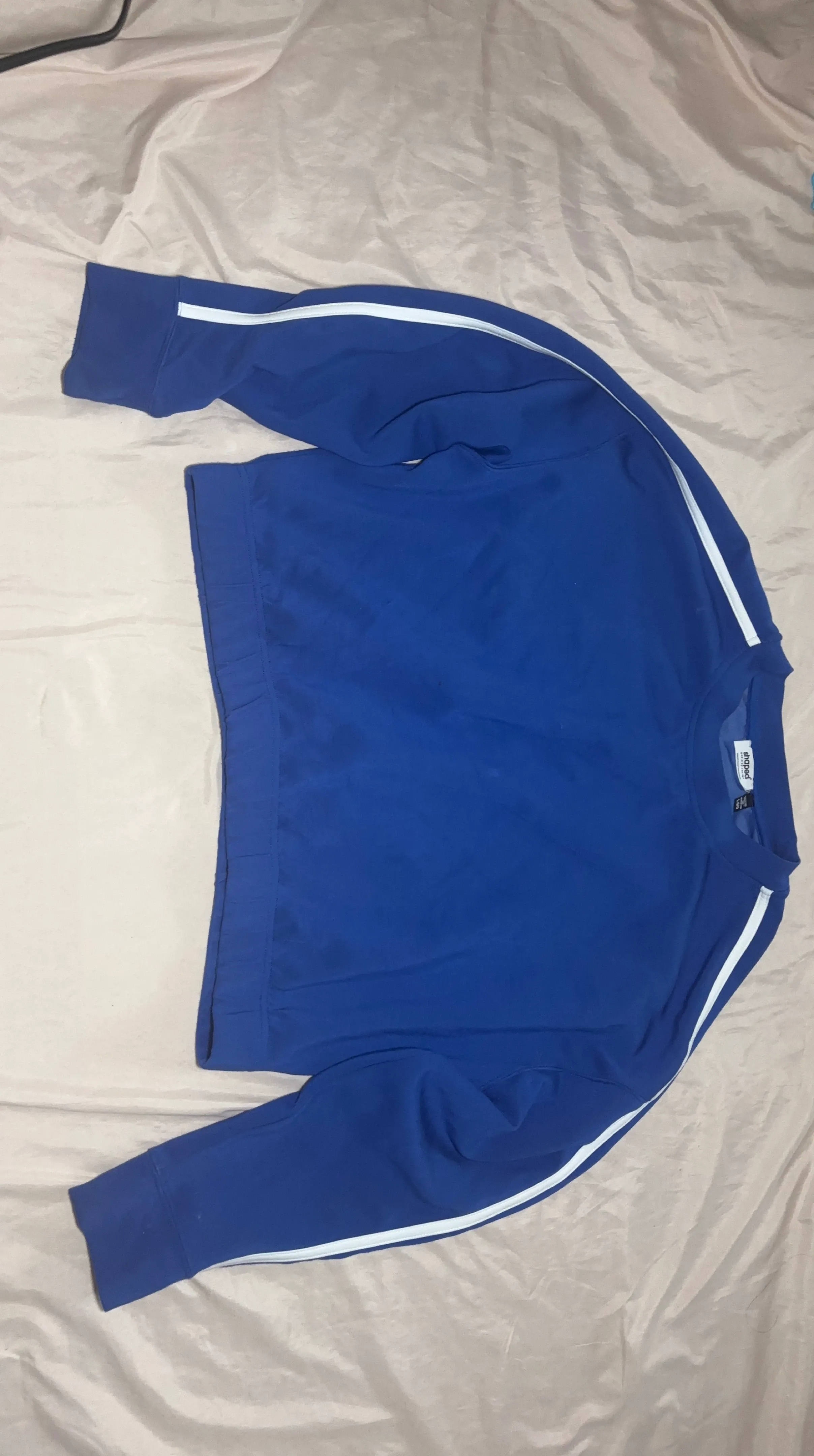 This is a blue long sleeve shirt from Old Navy. It has white stripes down the sleeves. Made of polyester and cotton blend.