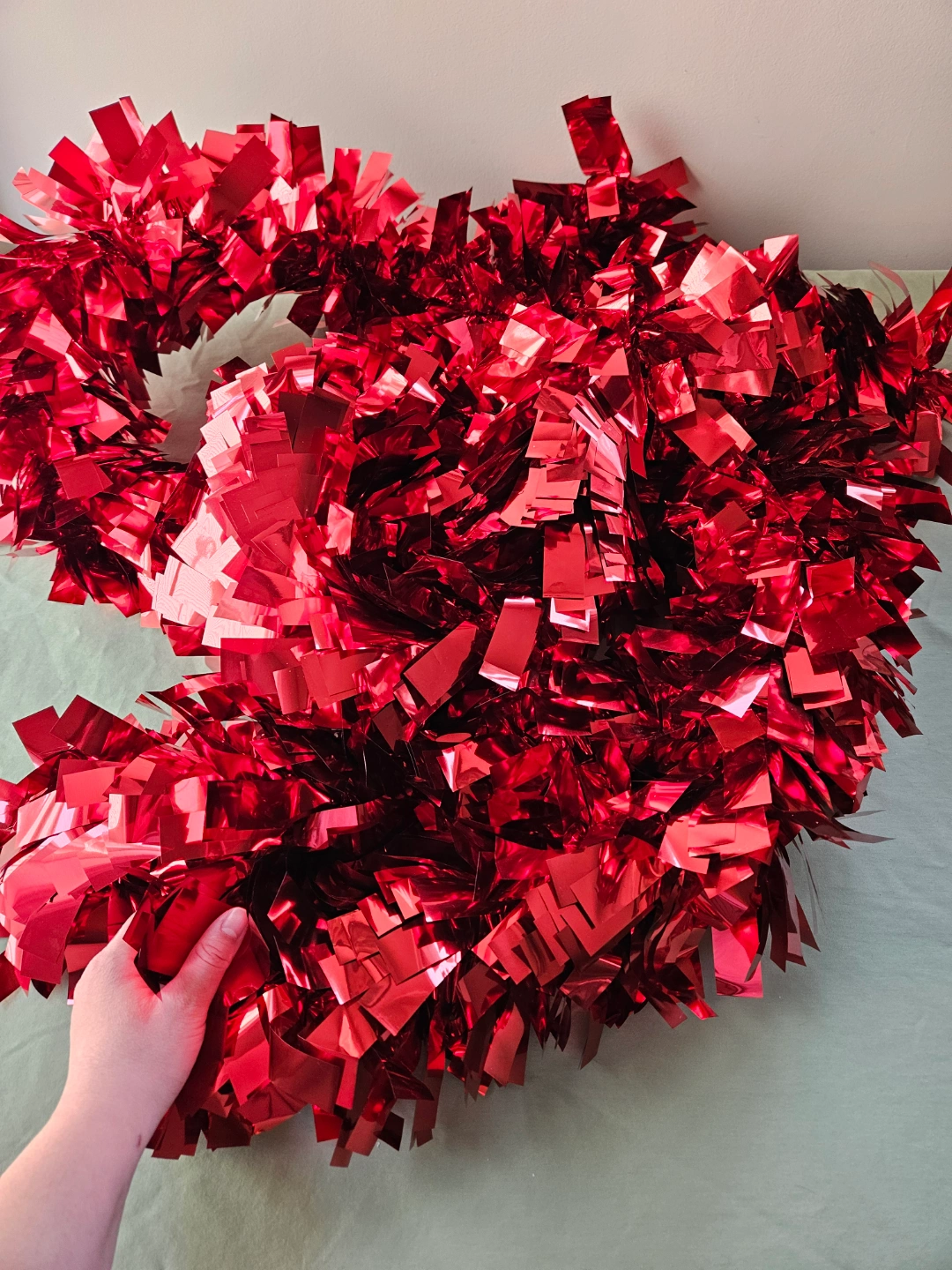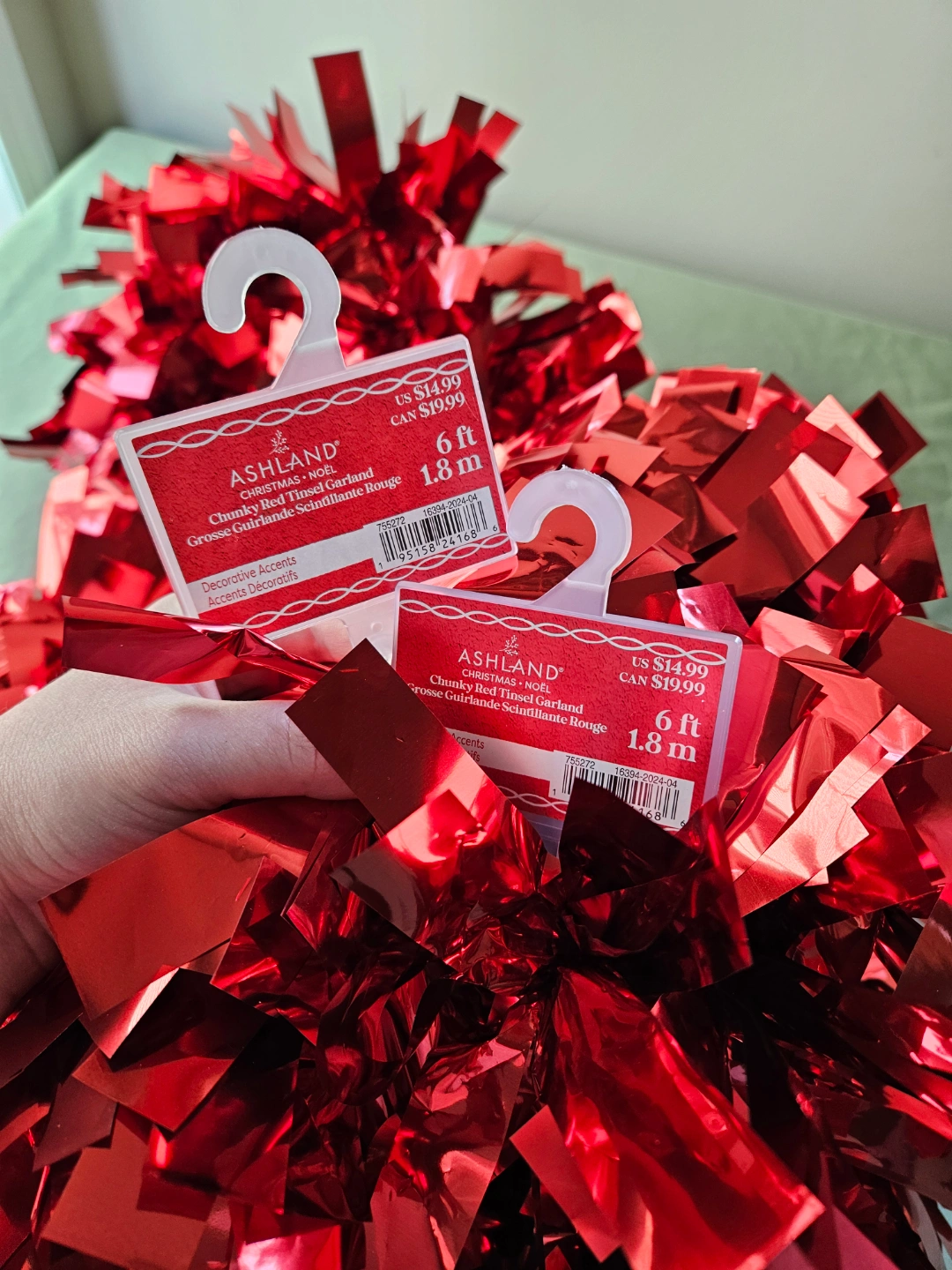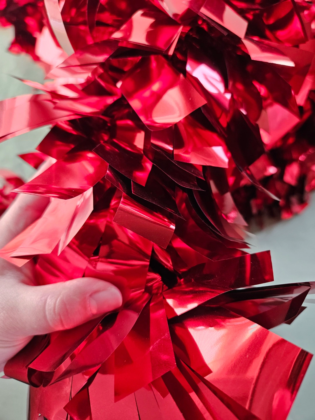 Two new red tinsel garlands. 6 feet long each. Never used. Great for Christmas decorations.