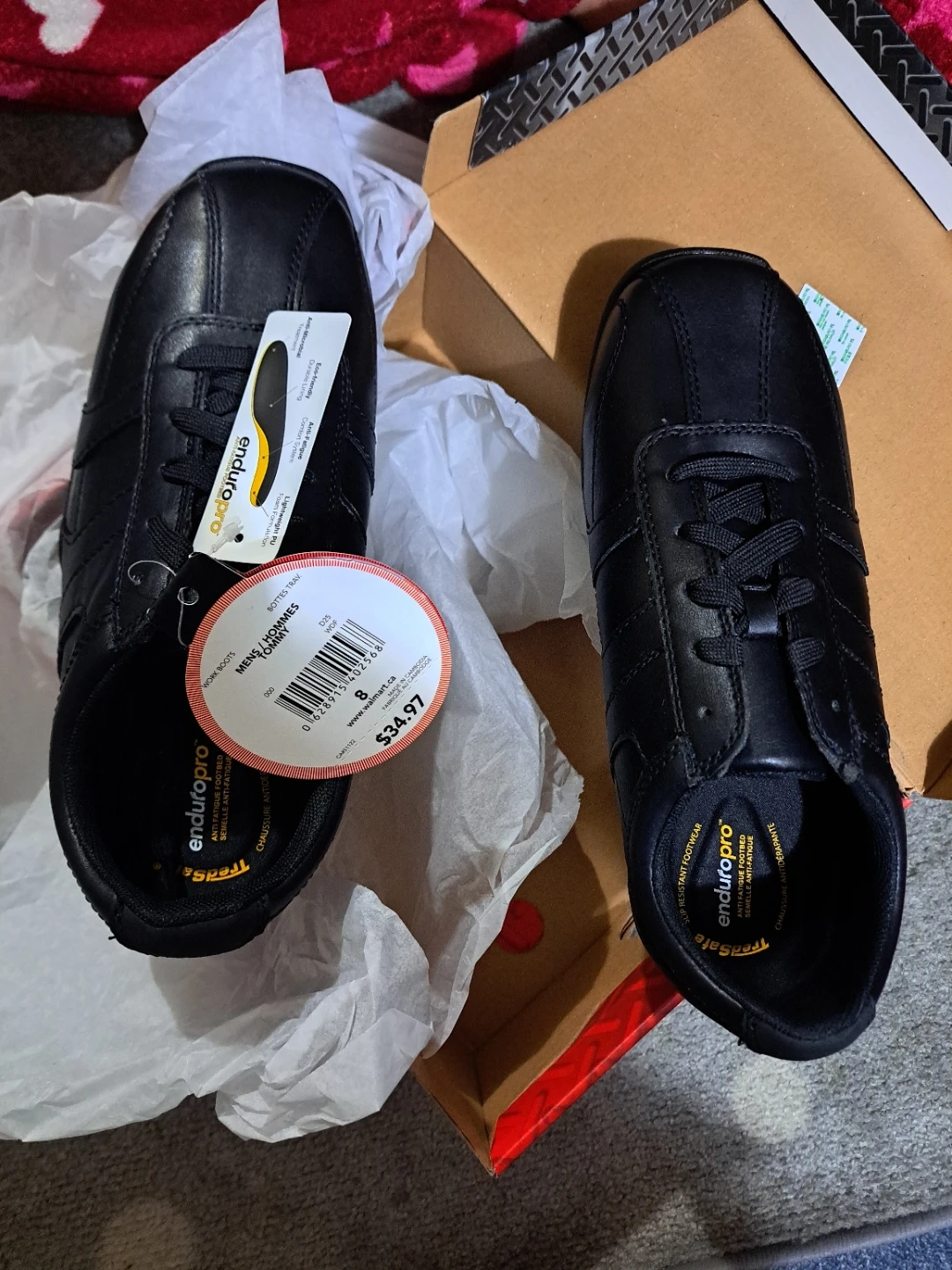 New TredSafe men's slip-resistant work shoes in black. These shoes are size 8 and feature a comfortable design for long wear. They include the original box and are ready for work!