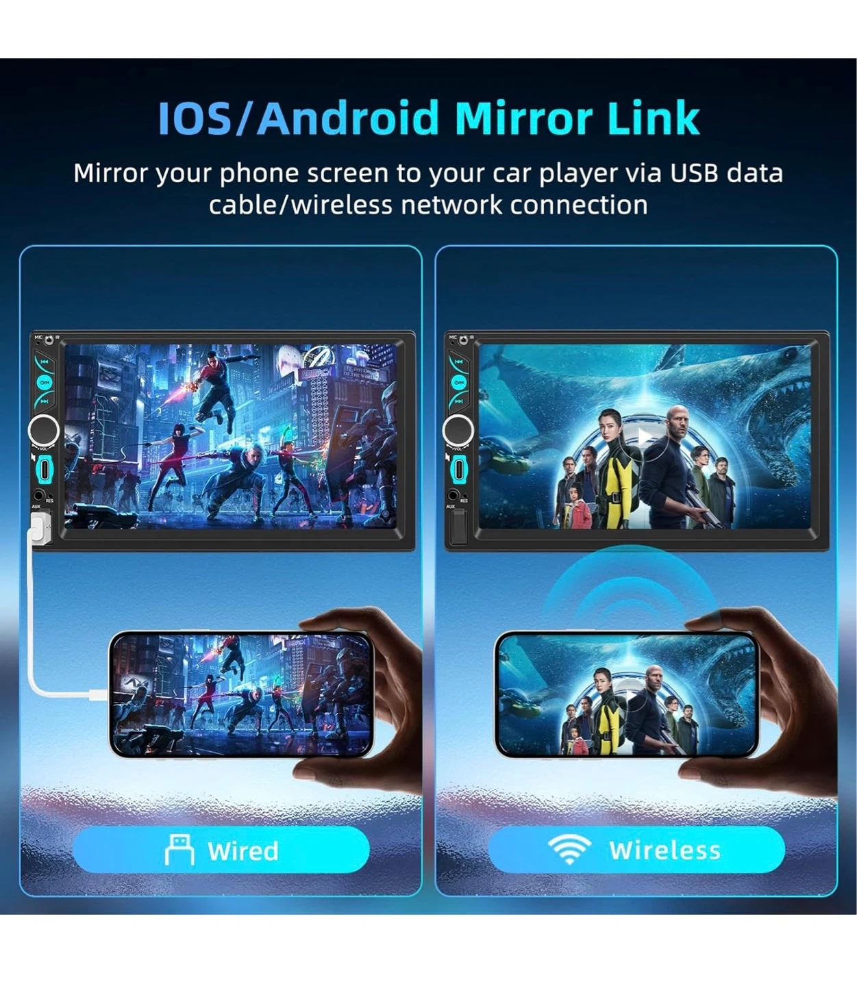 This is a 7-inch double din car stereo with wireless CarPlay and Android Auto support. It includes a touchscreen, Bluetooth, SWC, and mirror link functionality. The unit also comes with an HD backup camera and remote control.