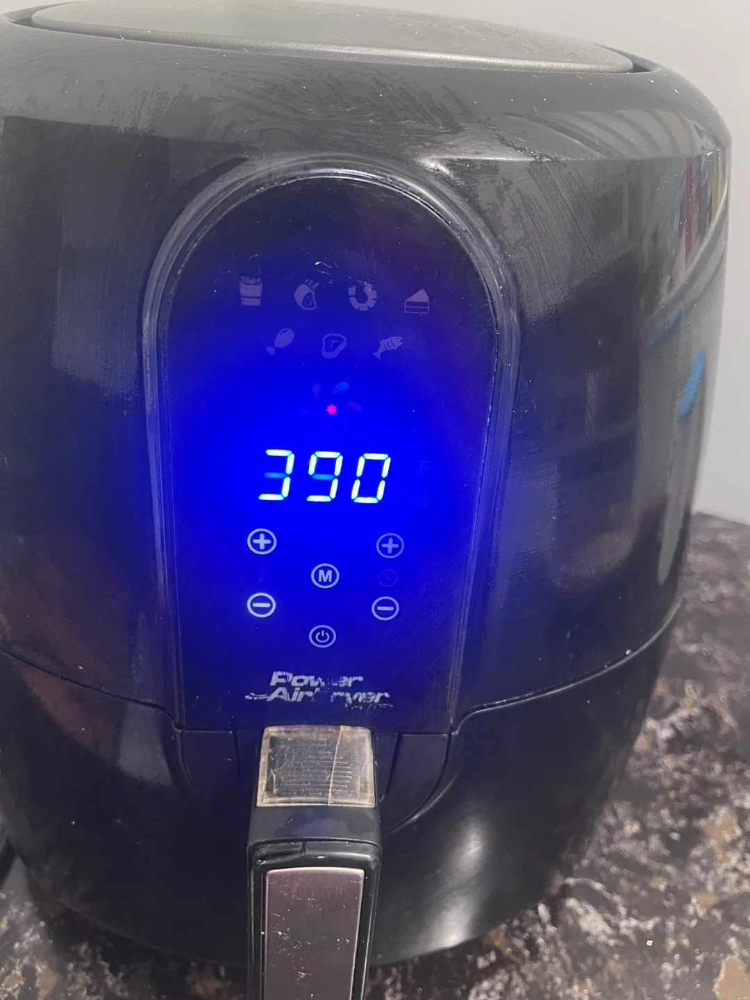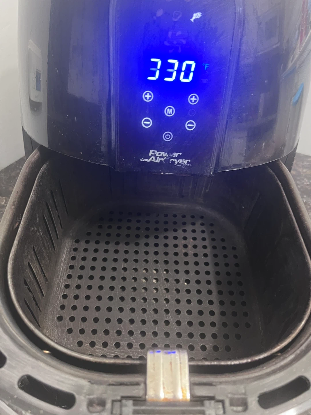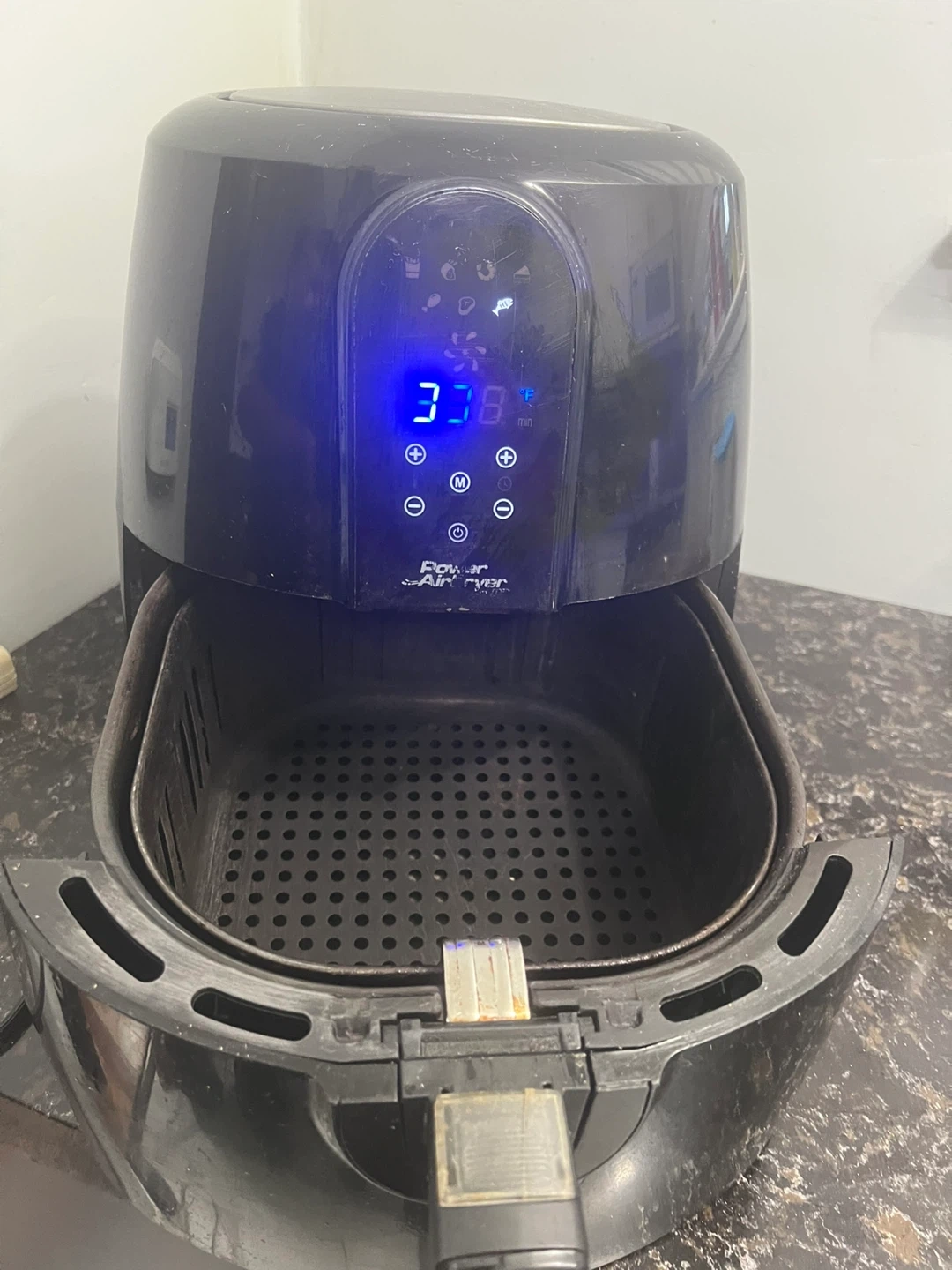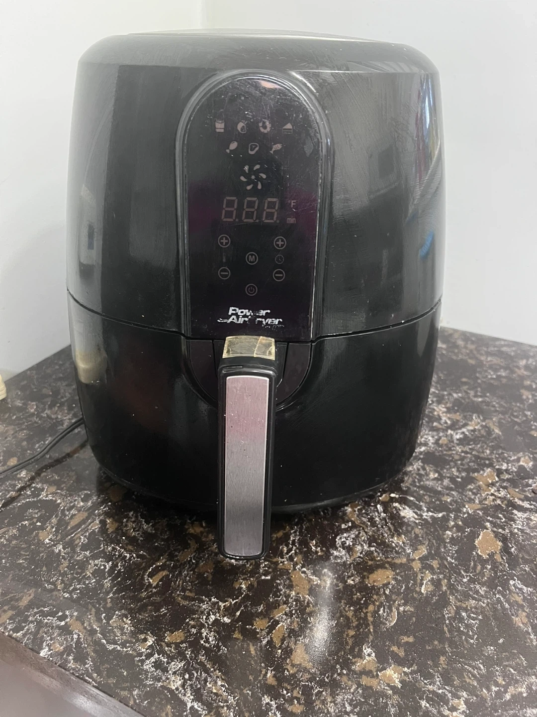 This is a black Power Air Fryer XL. It includes a basket for cooking. It's a useful kitchen appliance for quick meals.