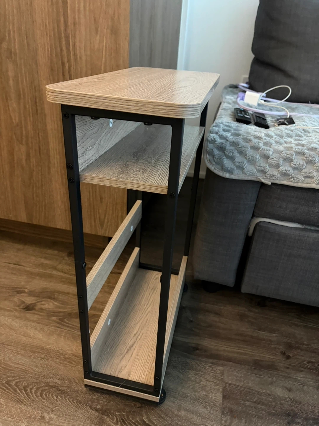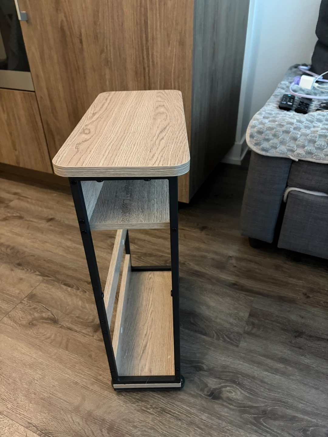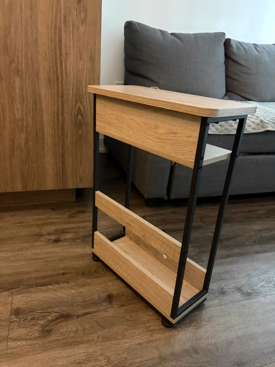 This slim side table. It's designed to fit into narrow spaces. The unit has a compact design with a modern aesthetic.