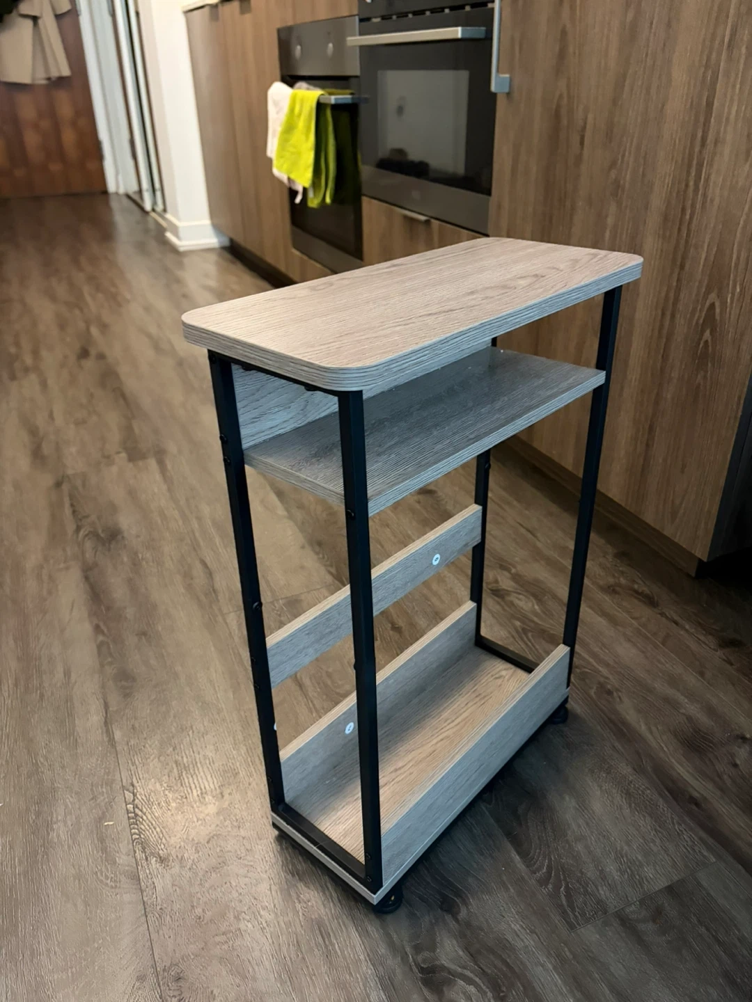 This slim side table. It's designed to fit into narrow spaces. The unit has a compact design with a modern aesthetic.