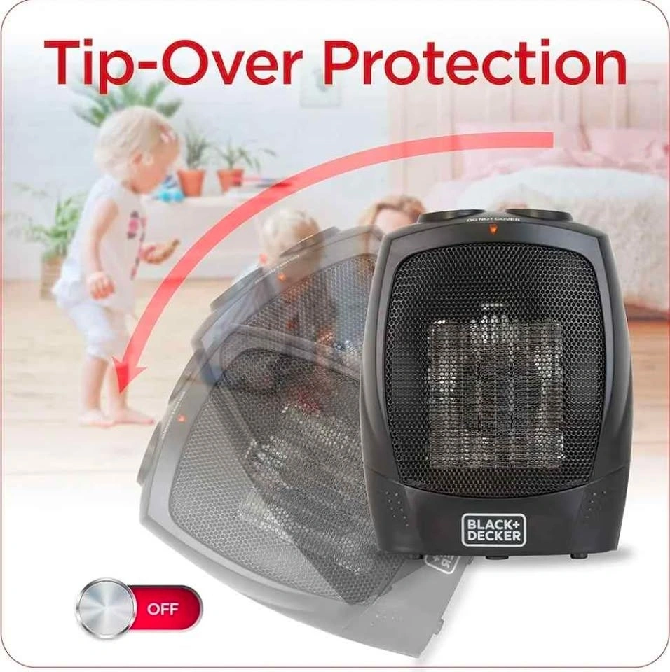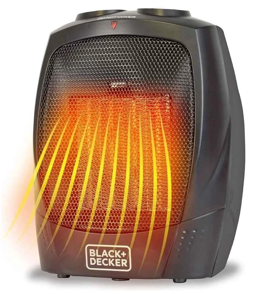 This Black + Decker heater is the perfect size for office desktops, basements, bedroom night tables, kitchen countertops, dorms and RVs. It will keep you cozy and comfy without taking up too much space. Ceramic heater with manual adjustable thermostat controls. 1500 Watts with 3 settings: Fan, Low Heat (900 Watts), High Heat (1500 Watts). Power on Indicator Light. Safety overheat protection. Safety tip over auto shutoff function. Power cord length: 6 feet.