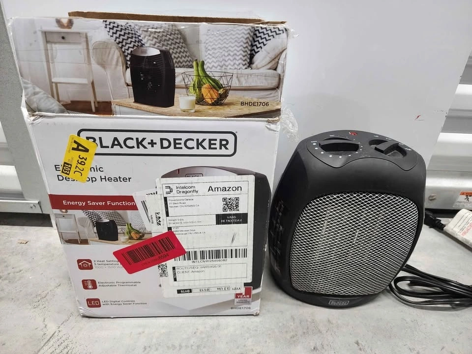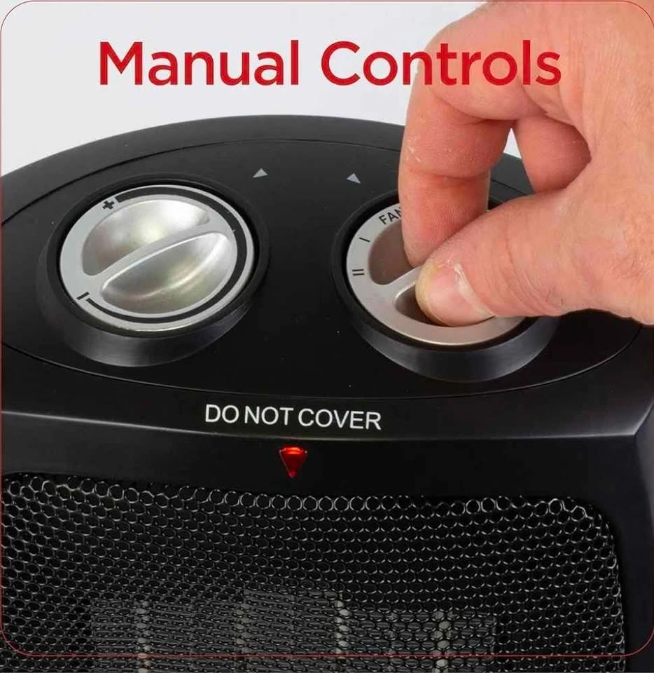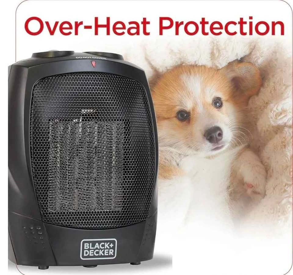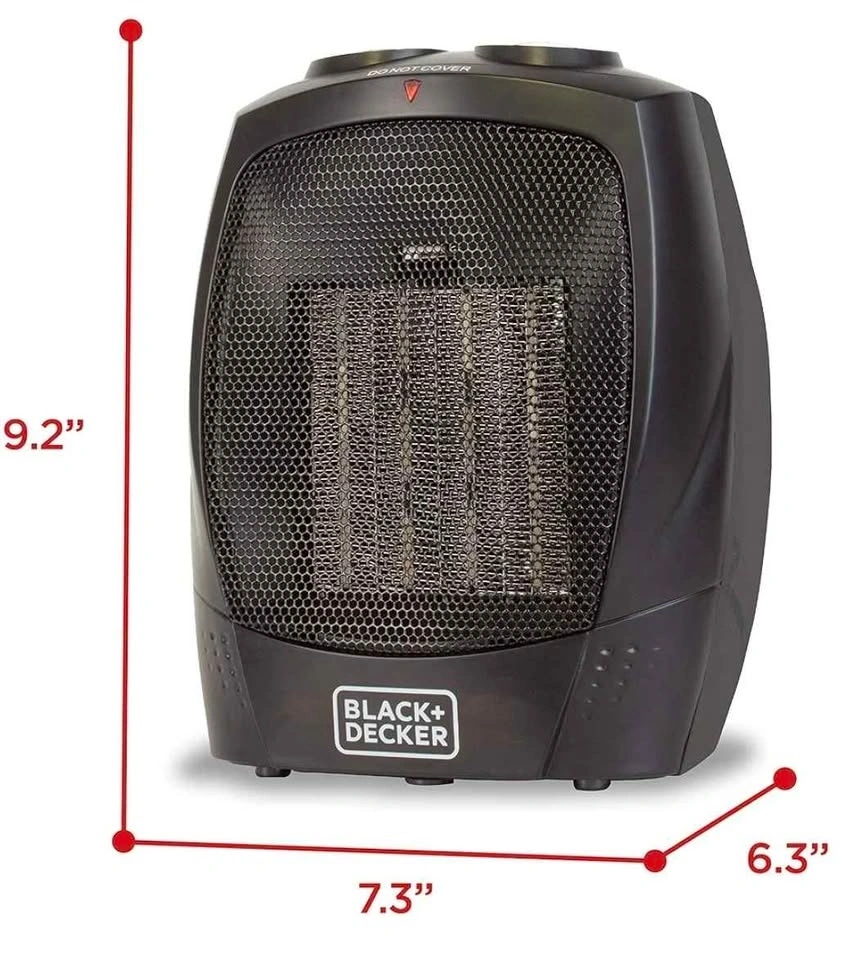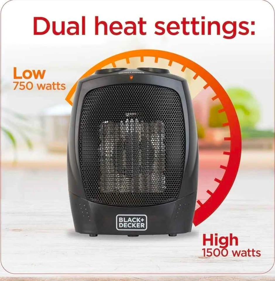 This Black + Decker heater is the perfect size for office desktops, basements, bedroom night tables, kitchen countertops, dorms and RVs. It will keep you cozy and comfy without taking up too much space. Ceramic heater with manual adjustable thermostat controls. 1500 Watts with 3 settings: Fan, Low Heat (900 Watts), High Heat (1500 Watts). Power on Indicator Light. Safety overheat protection. Safety tip over auto shutoff function. Power cord length: 6 feet.
