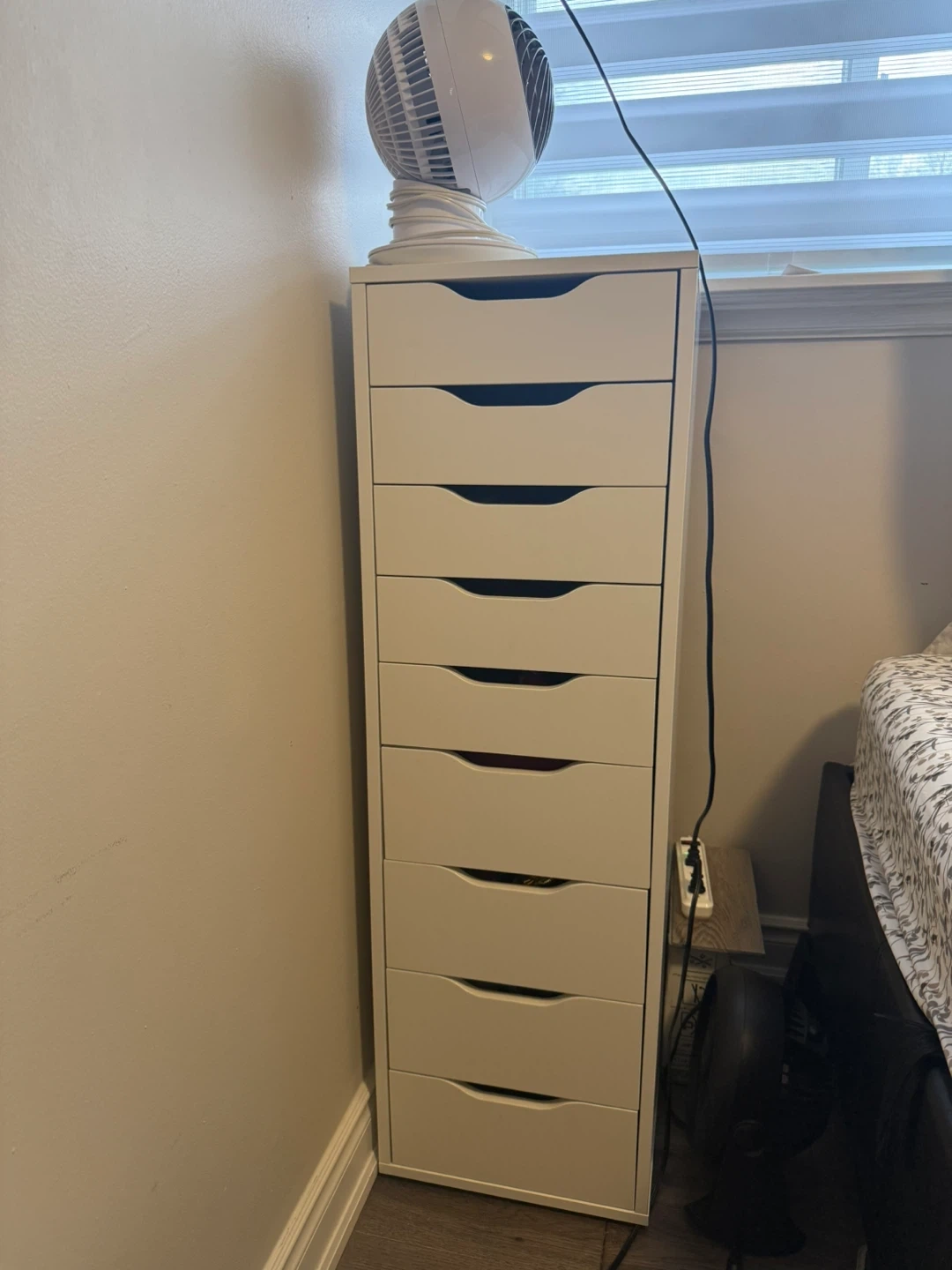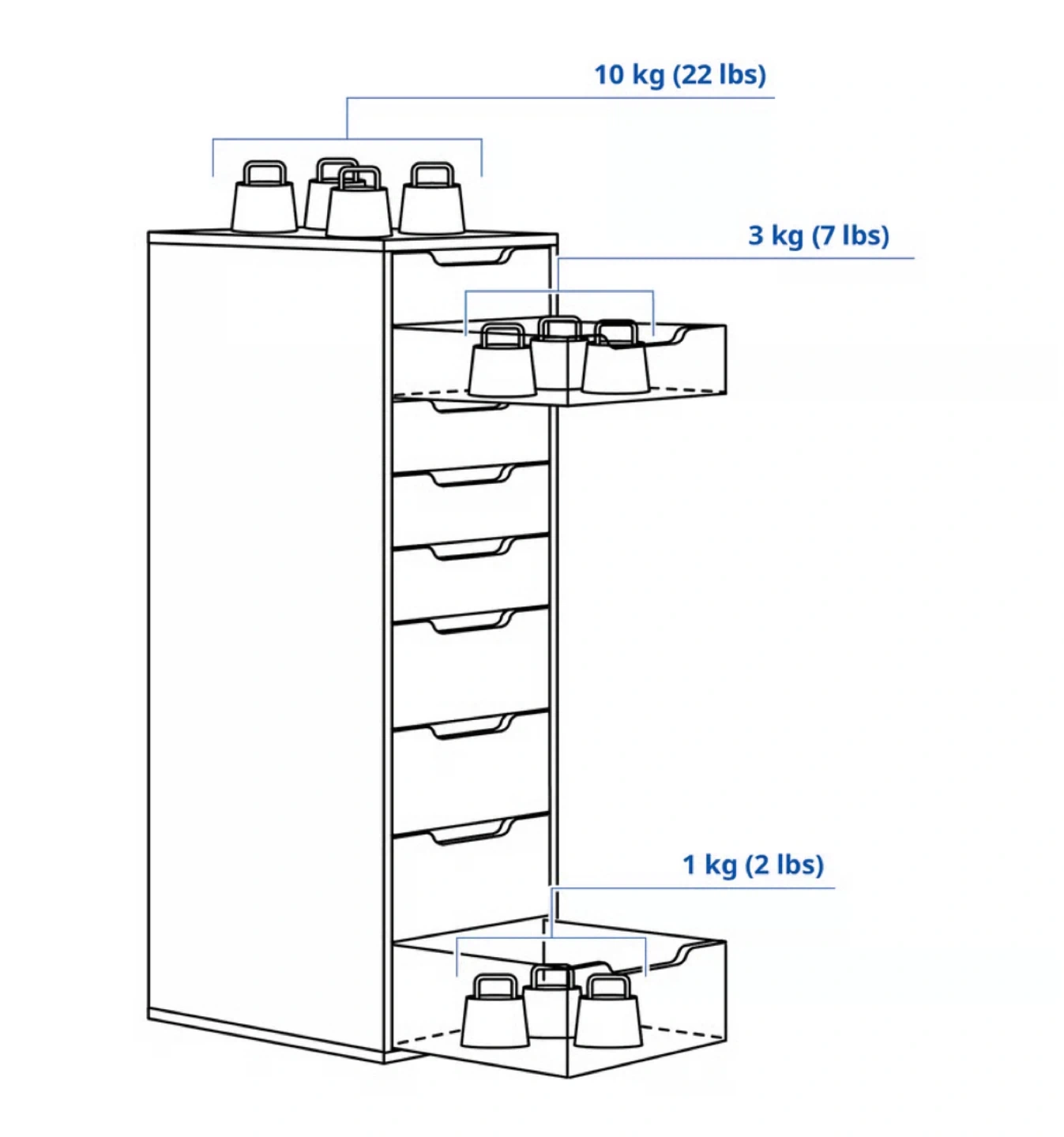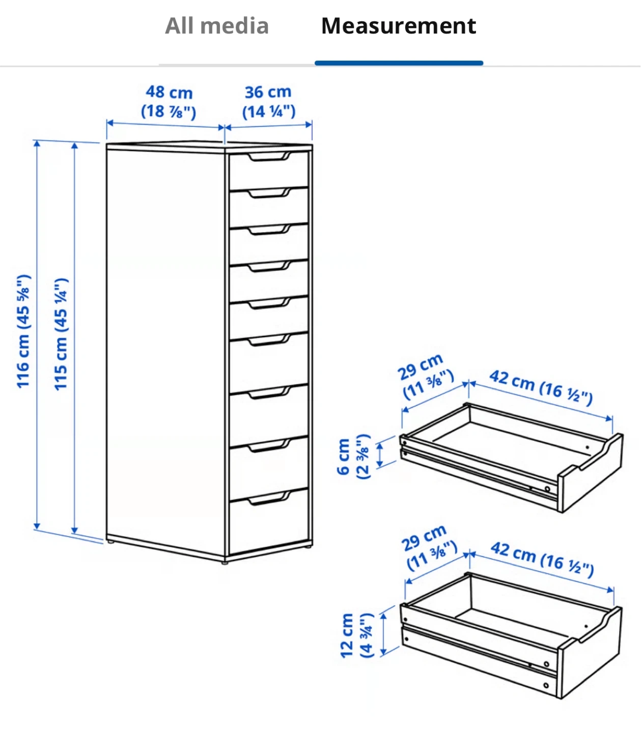This is an IKEA ALEX 9-drawer unit in white. It's 116 cm tall and 48 cm wide. Each of the top drawers can hold up to 3 kg (7 lbs) and the bottom ones can hold up to 10 kg (22 lbs). Perfect for storing makeup or craft supplies!