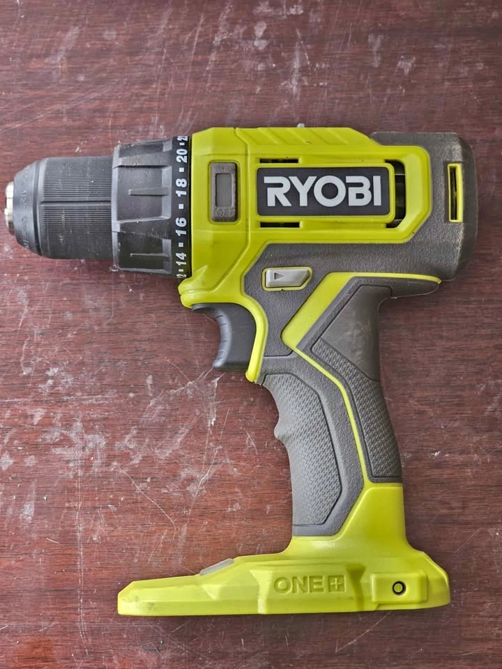 Ryobi ONE+ 18V cordless drill – tool only (no battery, no charger). Model: PCL206. Features a 1/2" keyless chuck, variable speed, adjustable clutch settings, and forward/reverse. Works with all Ryobi ONE+ 18V batteries. In good working condition with light cosmetic wear from normal use. Perfect for home projects or as a spare drill.