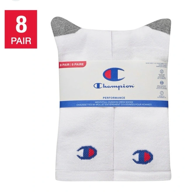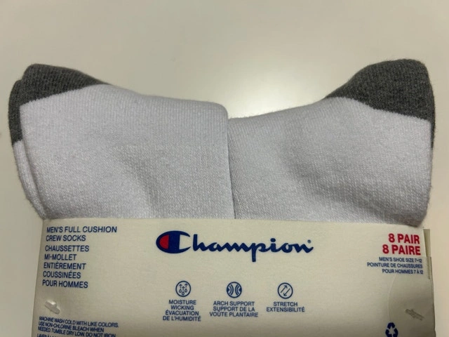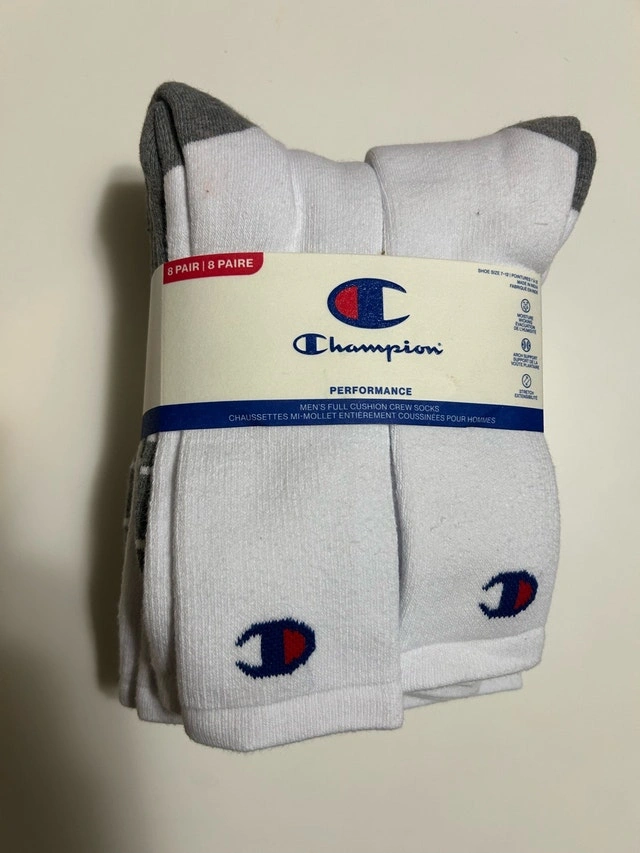 Brand new in pack! These Champion full cushion crew socks are perfect for everyday wear. The pack contains 8 pairs of comfortable and durable stretch socks, made with moisture-wicking fabric and arch support. They fit men's shoe sizes 7-12. Great quality, perfect for the gym or everyday use. Specifications: Brand: Champion, Type: Crew Socks, Size: Men's shoe size 7-12, Quantity: 8 pairs, Features: Full cushion, moisture-wicking, arch support, Fabric Content: 76% cotton, 22% polyester, 2% elastane. If the ad's up, they're available! Remember to check out my other ads. Discount available for multiple purchases!