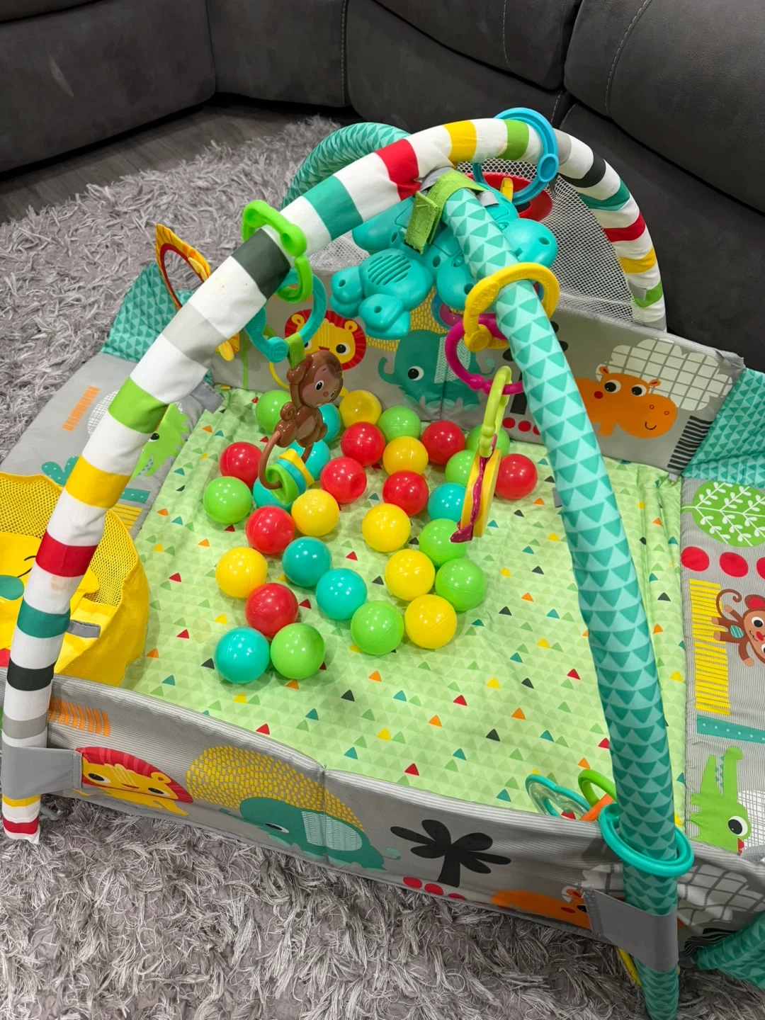 This baby play gym features a soft mat and an overhead arch with hanging toys. It includes a ball pit feature with colourful balls. It's designed for little ones to explore and play. This play gym is great for developing motor skills and sensory exploration.