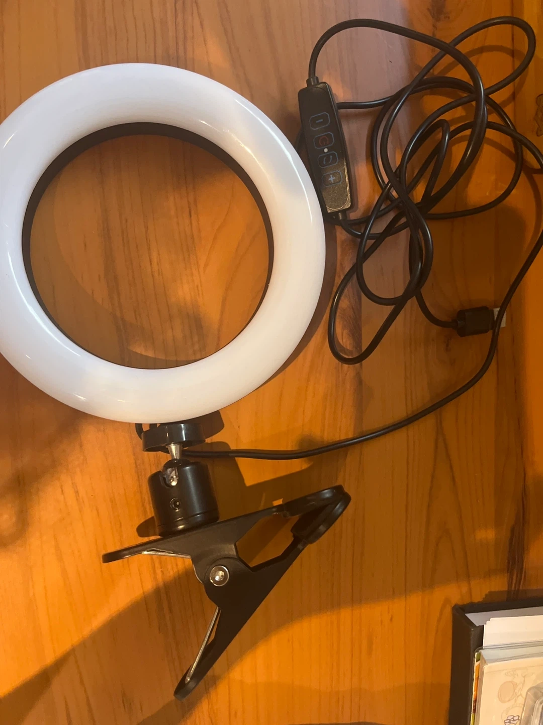 Portable LED ring light for photography and video. It features adjustable brightness and colour temperature. The clip mount makes it easy to attach to desks or shelves.