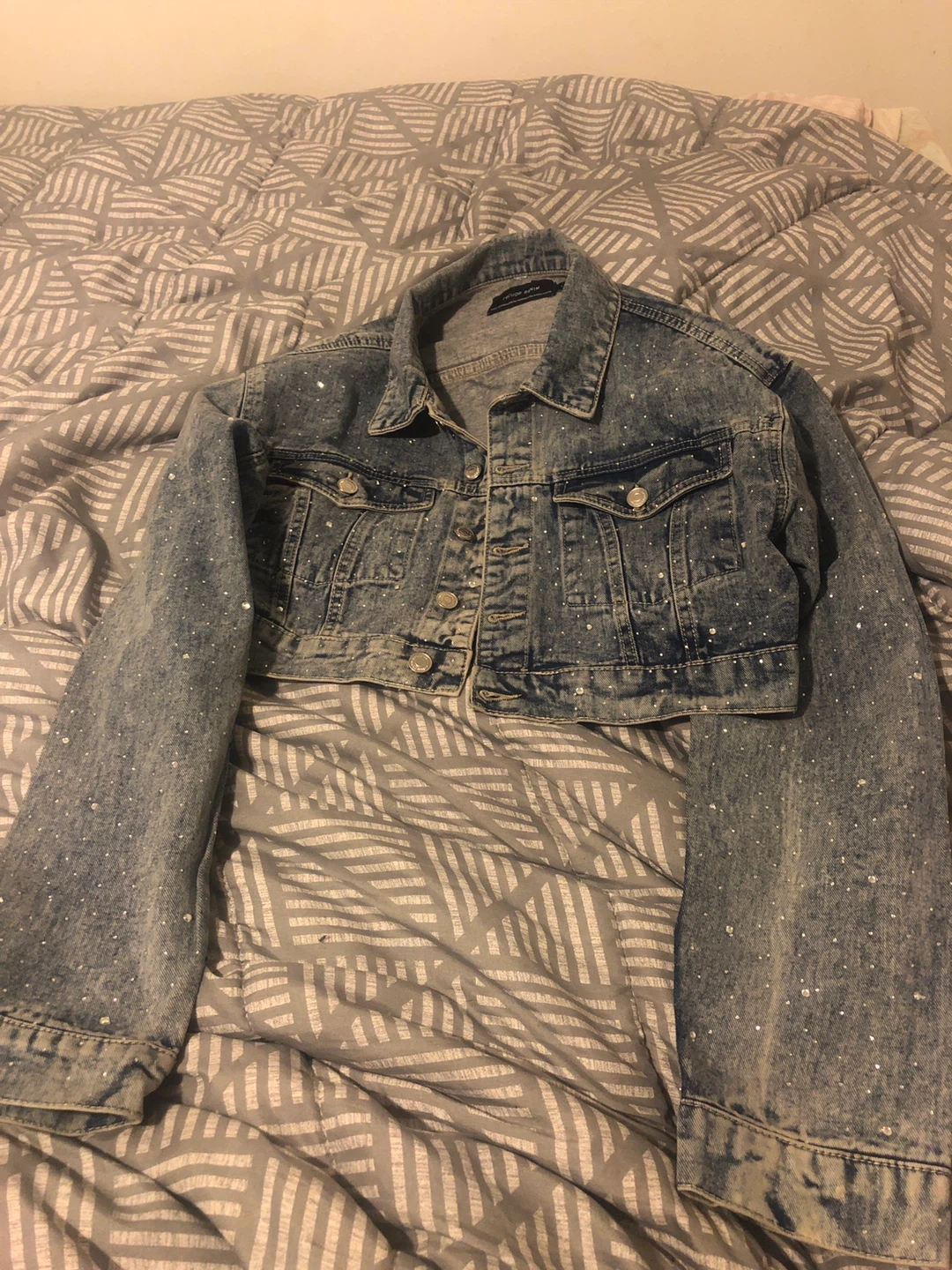 Selling a cute Rethink Denim jean jacket! It's a light wash denim with some sparkly details. Perfect for layering or adding a bit of sparkle to your outfit!