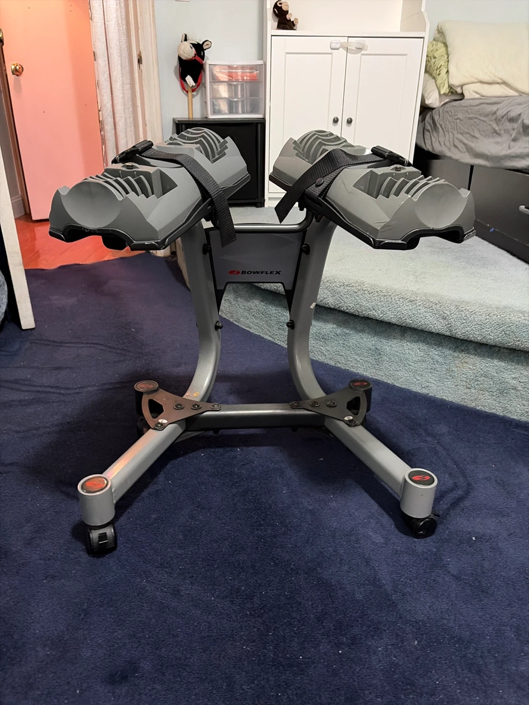 Adjustable dumbbells with rotating weight selection dials. Includes the dumbbell stand. Easy to switch weights for your workout. Great for home gyms!