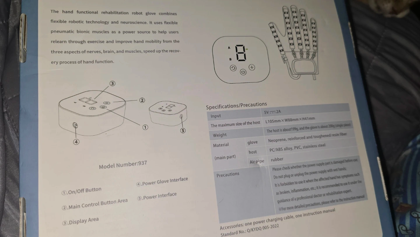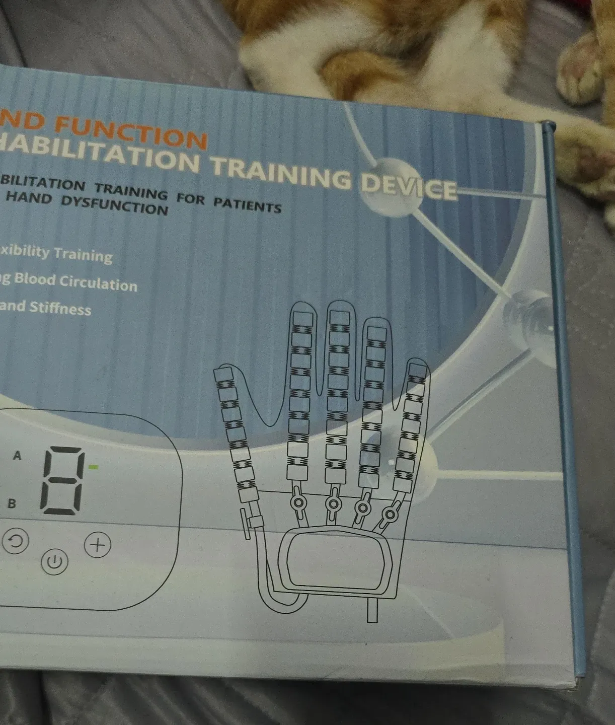 This is a hand function rehabilitation training device designed for patients with hand dysfunction. It's designed to provide hand flexibility training, promote blood circulation, and solve hand stiffness. It comes with an instruction manual and a power charging cable. The manufacturing date is 2025 February 26