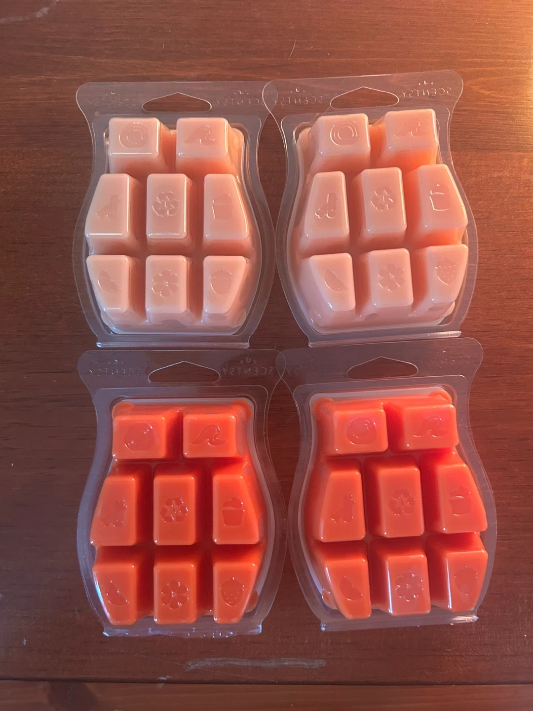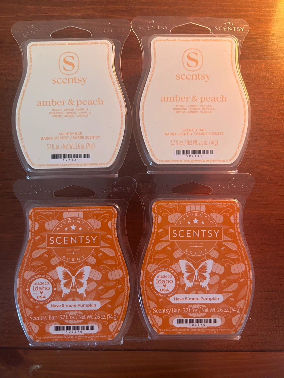 Two Scentsy bars in Amber & Peach and two in Have a "Pumpkin" Spice. Each bar is 3.2 oz. Made in Idaho, USA. It's perfect for warmers to scent a room!