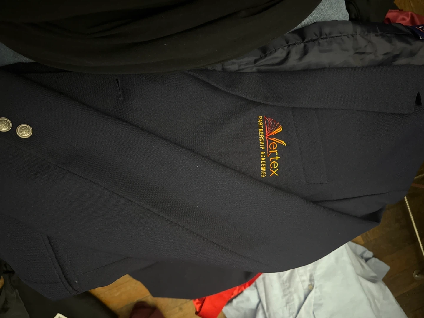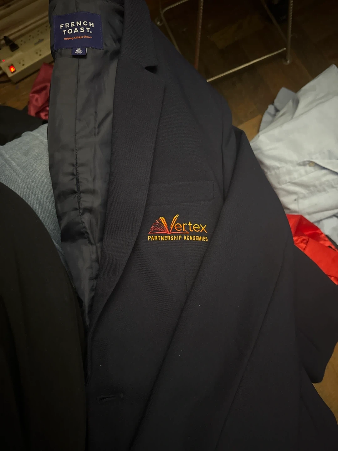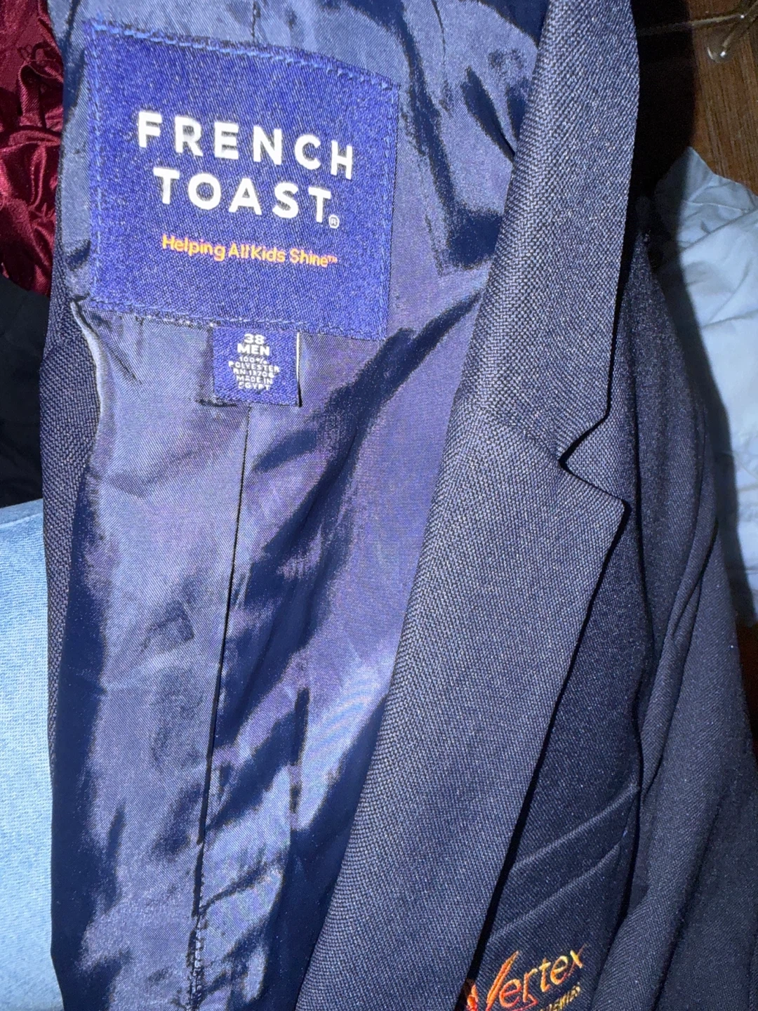 This French Toast blazer is navy and suitable for boys, size 38. It features the Vertex Partnership Academies logo on the chest. Polyester and cotton blend material.