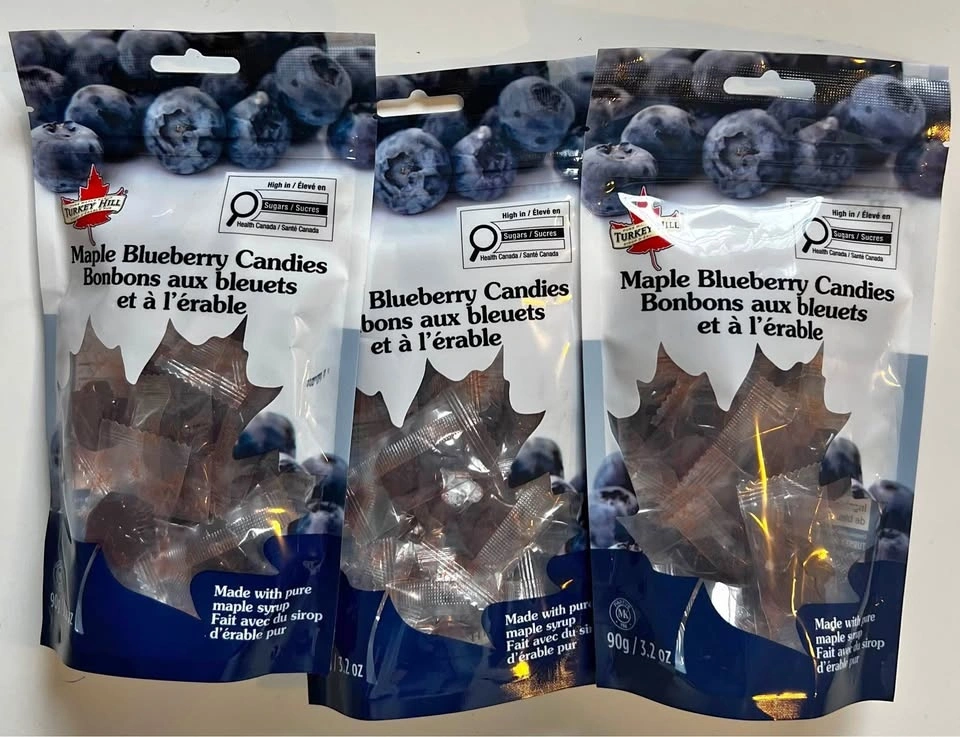 Sealed bags of individually wrapped Turkey Hill Maple Blueberry hard candy. 90g per bag.