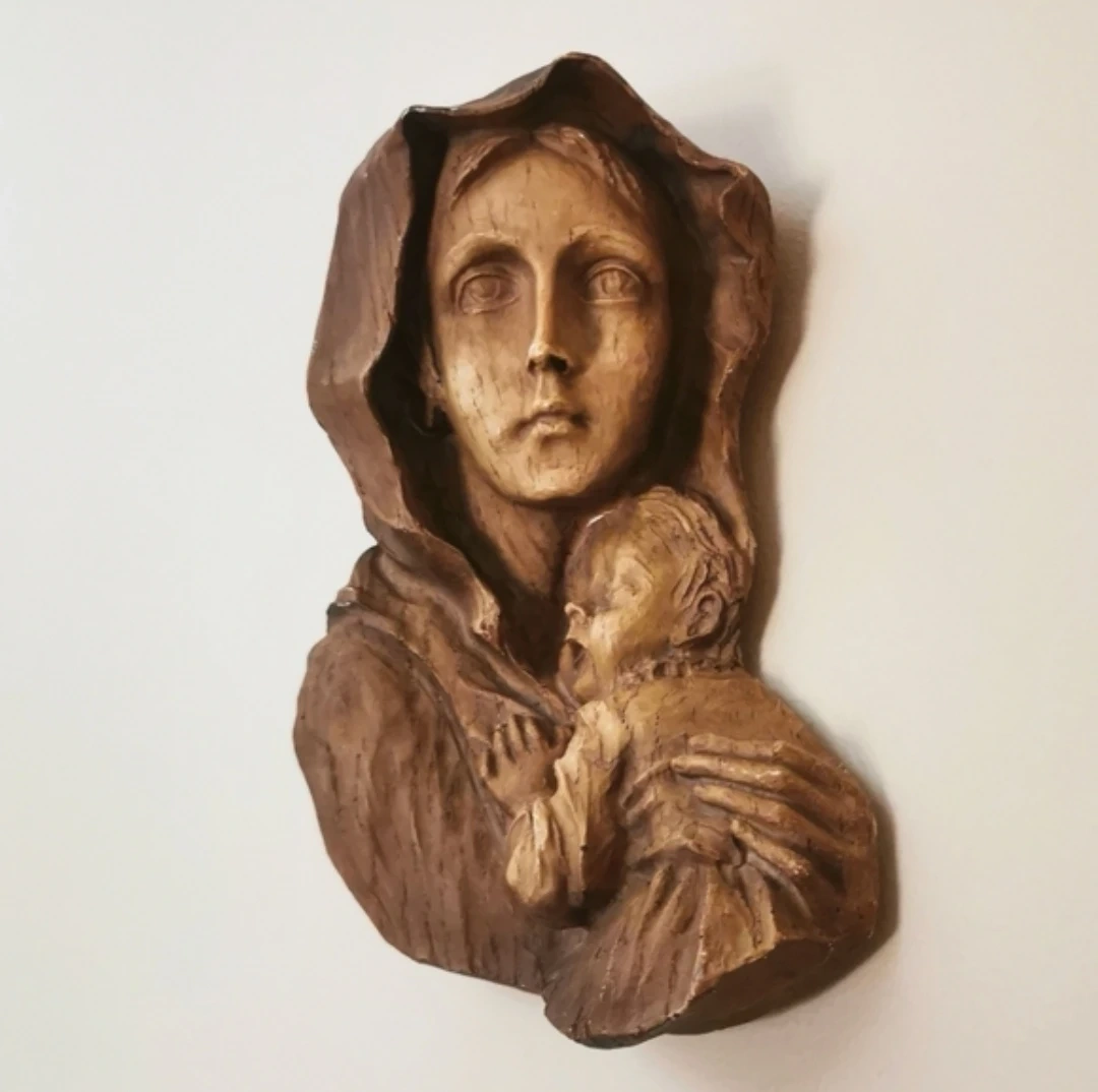 Beautiful vintage hand-carved Madonna and Child wall plaque, featuring a serene depiction of the Virgin Mary holding baby Jesus. This piece showcases intricate detailing, expressive facial features, and a warm rustic patina that adds to its timeless charm.